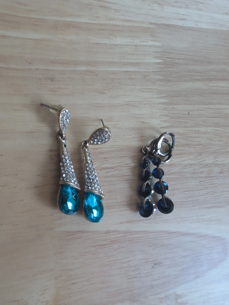 a set of assorted earrings. One pair is a teardrop shape with blue stones, and the other is a cluster of blue beads.