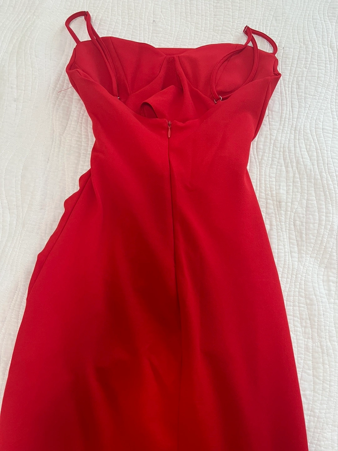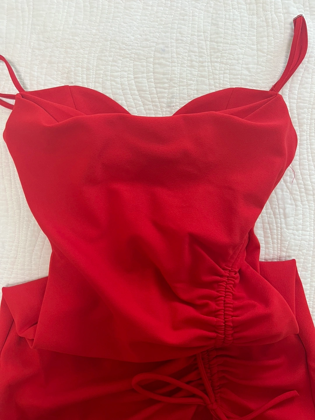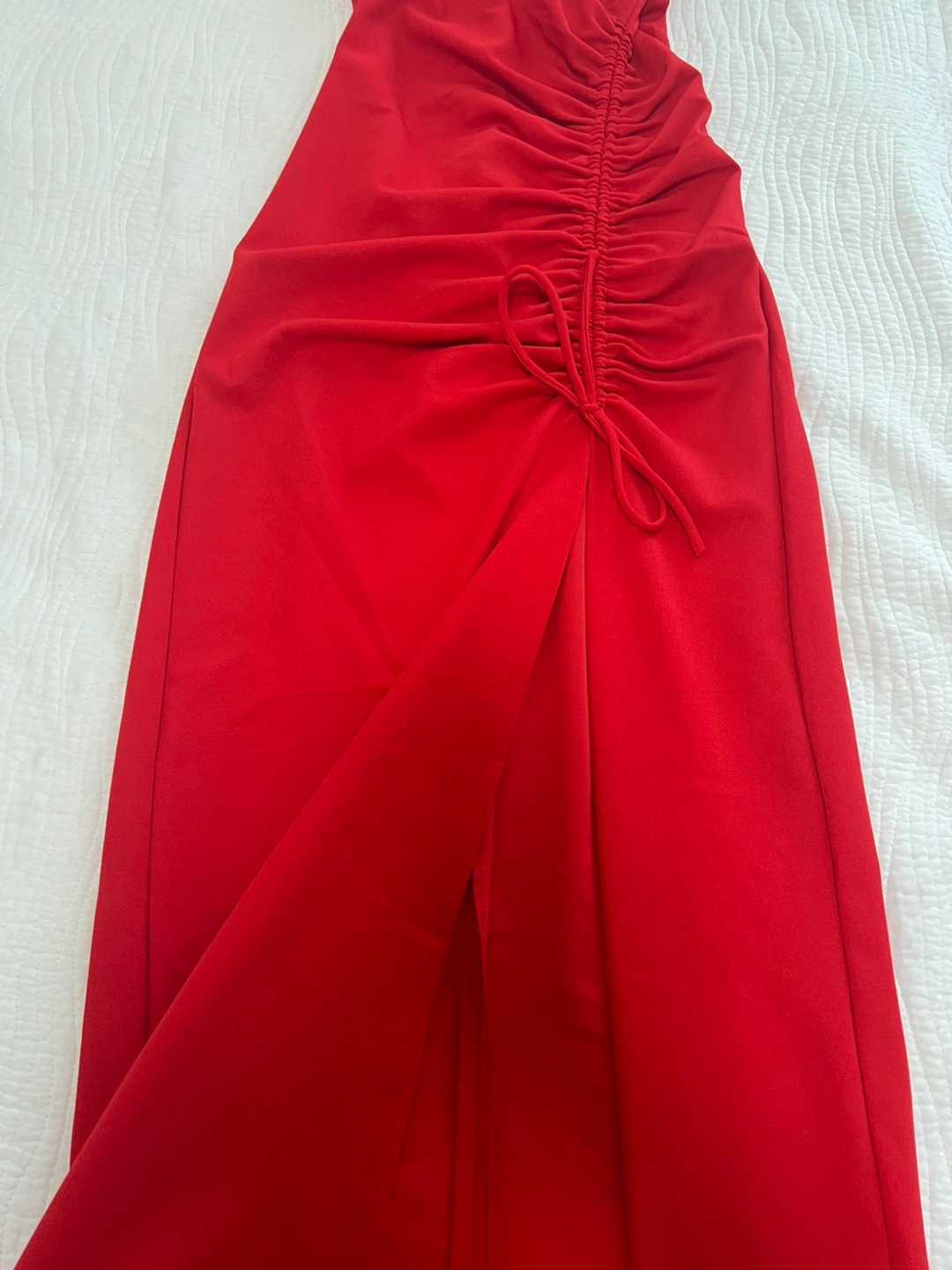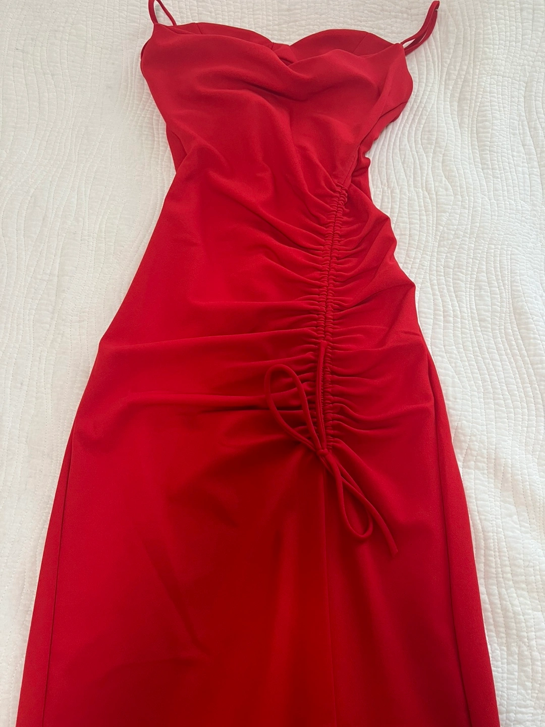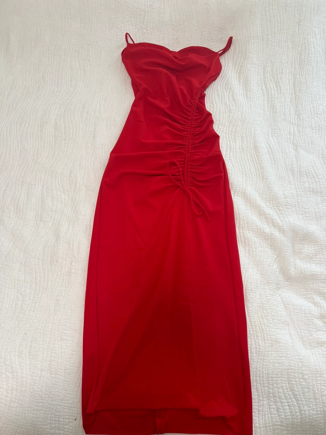 Selling a cute red midi dress with ruching detail and a slit! It's in great condition and ready for a new home. Perfect for a night out or a special occasion