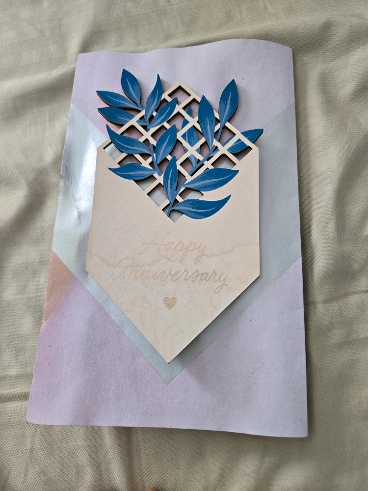 A lovely handmade anniversary card! Perfect for celebrating a special couple and their love story. The card features a unique design with a wooden envelope and blue leaves. Inside, there's a heartfelt message to celebrate their love.