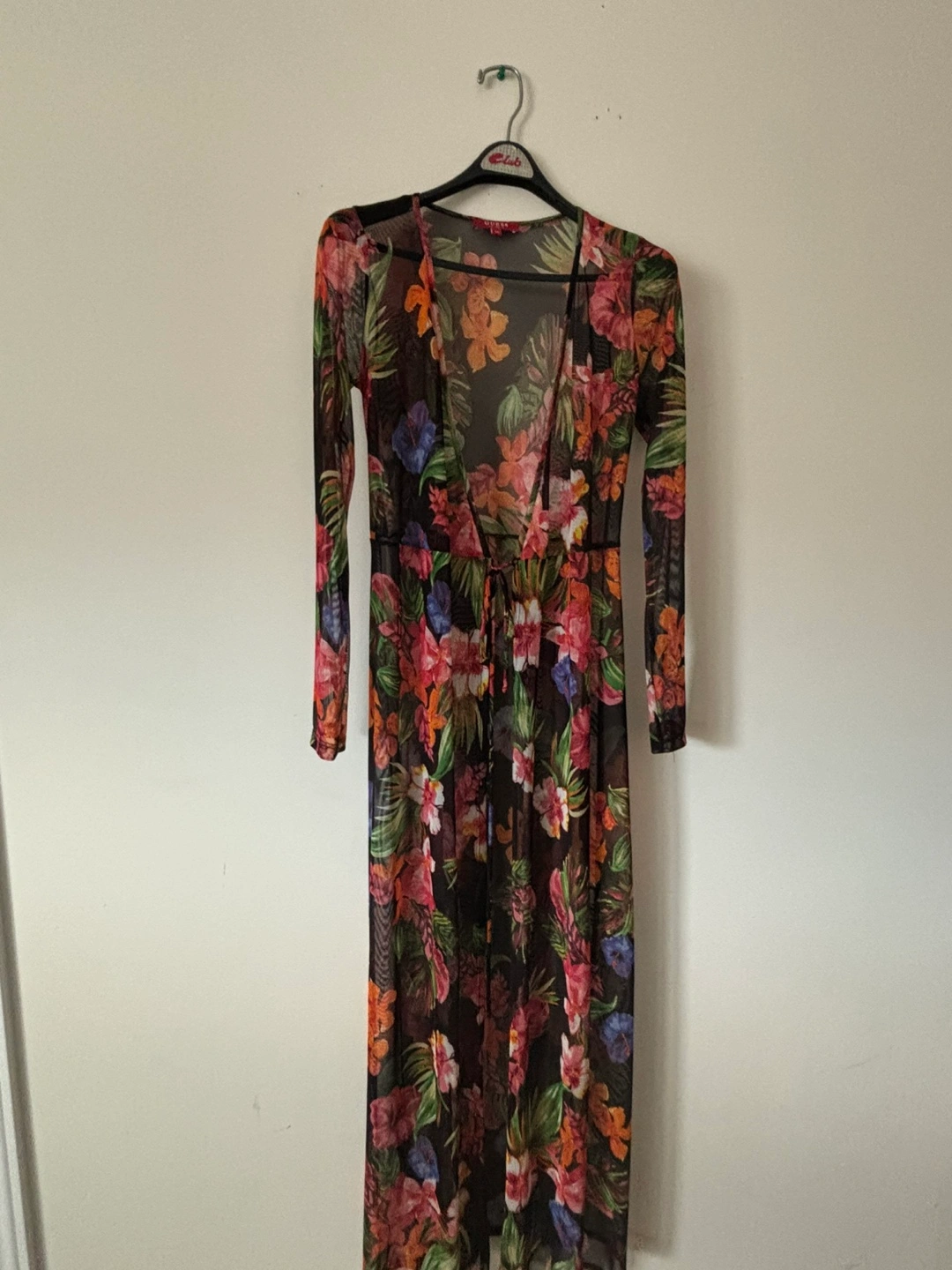 This is a beautiful floral mesh cover-up from Guess. It's a size XS and features a vibrant floral pattern. Perfect for adding a touch of style to your outfit!