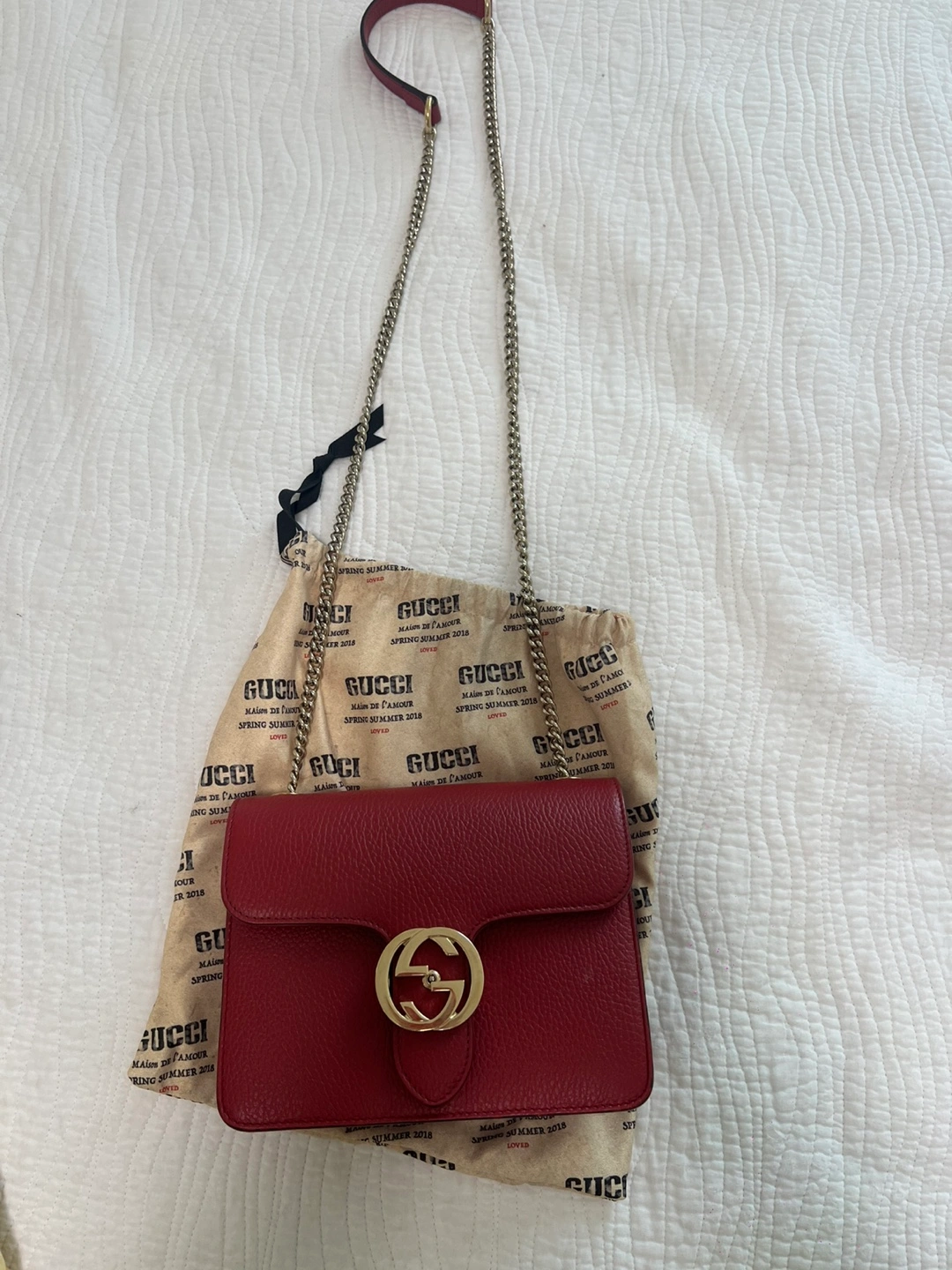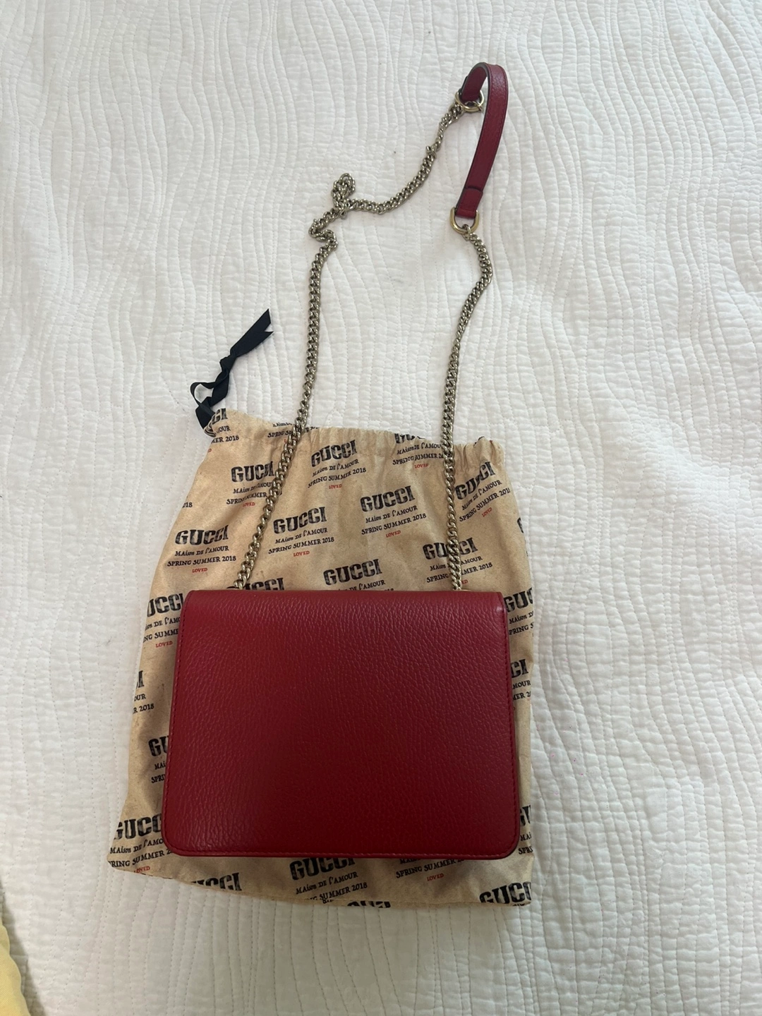 Selling a beautiful Gucci chain wallet in red leather! It's in great condition and comes with its original dust bag. Perfect for adding a pop of colour to any outfit! The chain strap is great for wearing it as a shoulder bag or crossbody