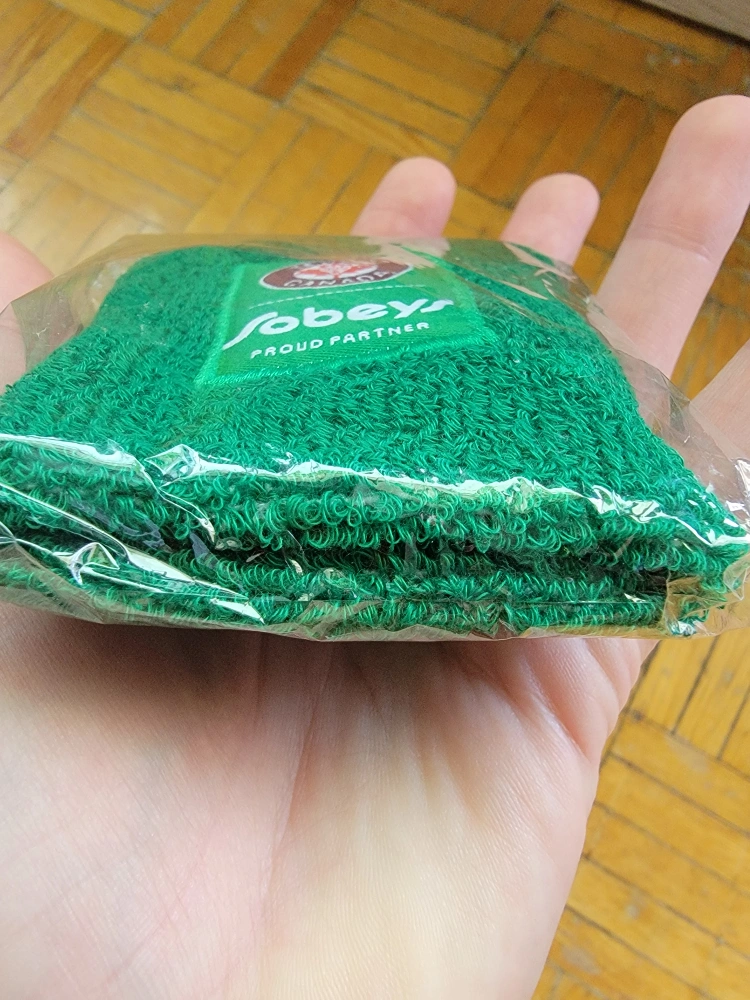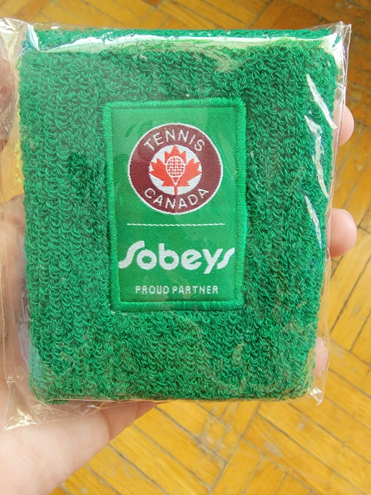 I have a brand new Sobeys Tennis Canada wristband still in its original packaging! It's a vibrant green and perfect for keeping you dry during your tennis matches or any other activity where you need to wick away sweat. A great way to show your support for Tennis Canada!