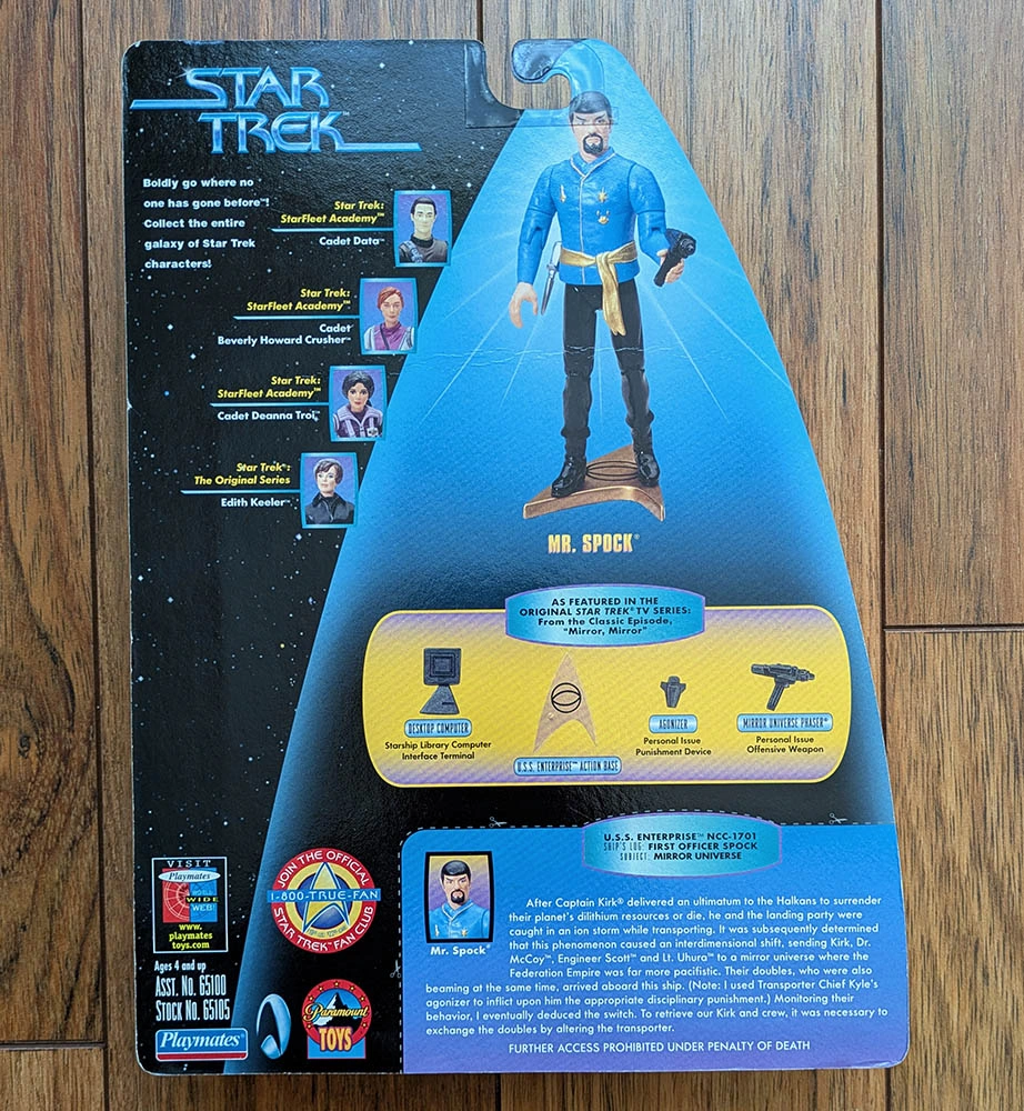 This is a very rare error card with a Mr. Spock action figure from the episode "Mirror, Mirror" on an Edith Keeler insert.