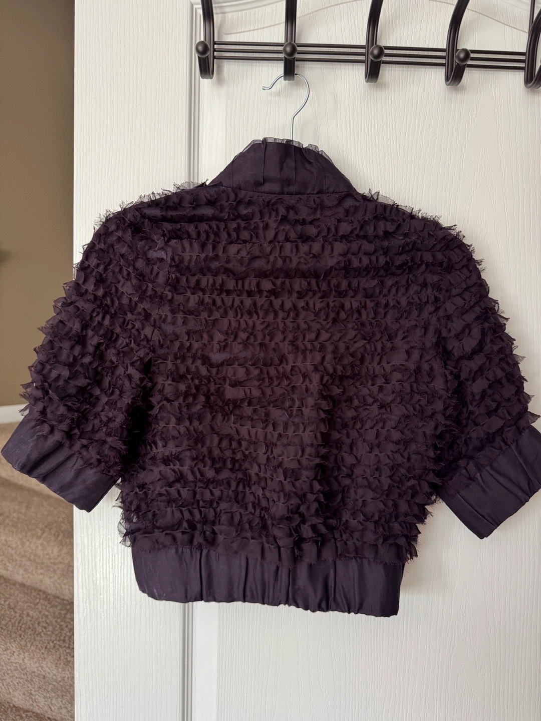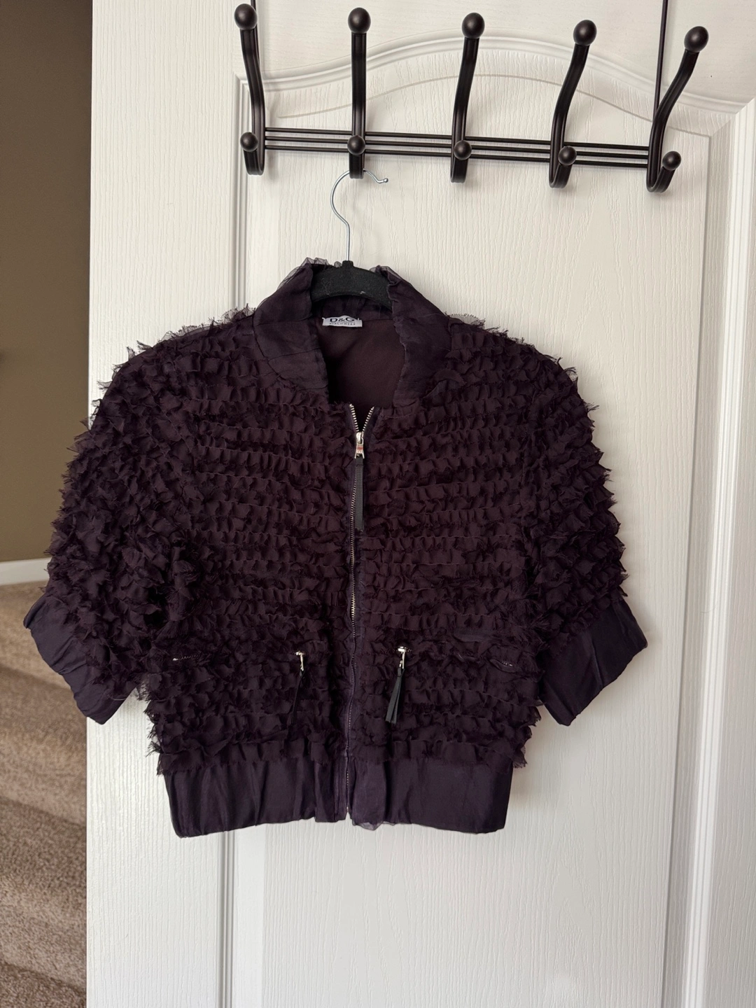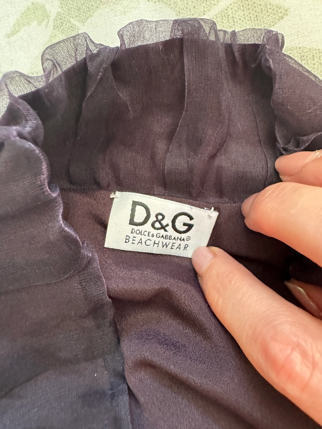 I'm selling a D&G (Dolce & Gabbana) Beachwear jacket. It's a size small and has a unique ruffled design. It's in great condition and would be a stylish addition to your wardrobe!