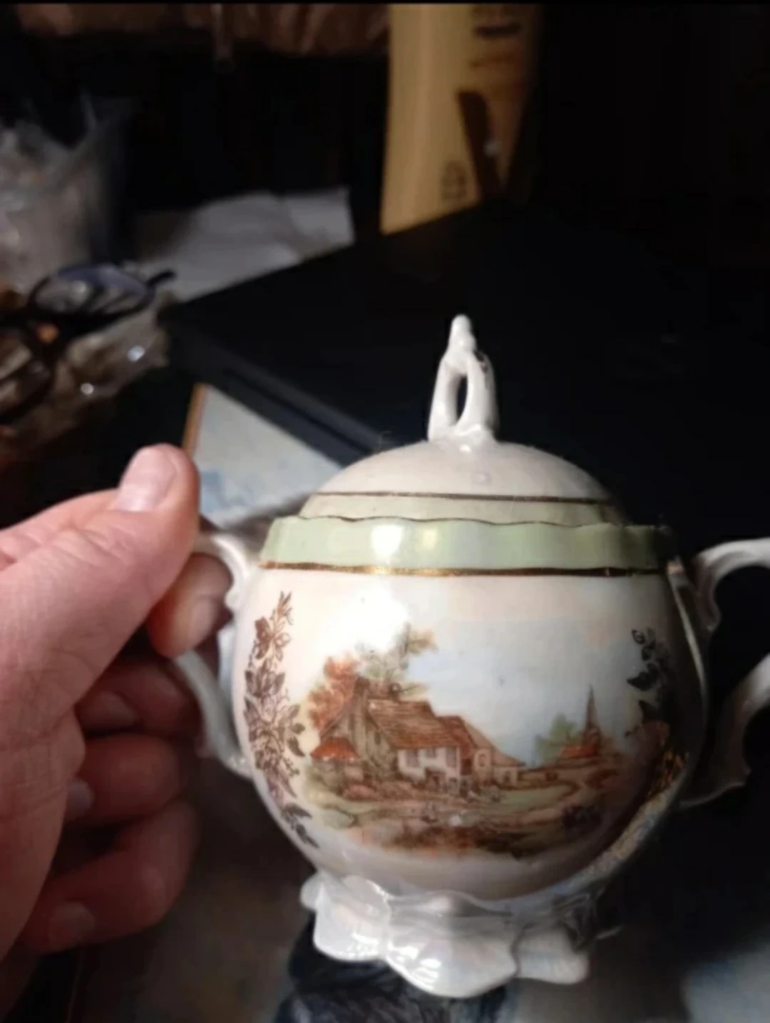 Vintage sugar bowl with a lid. It features a charming landscape design and gold trim. Perfect for adding a touch of elegance to your tea set or collection! There are a couple of areas with some wear, as shown in the photos.