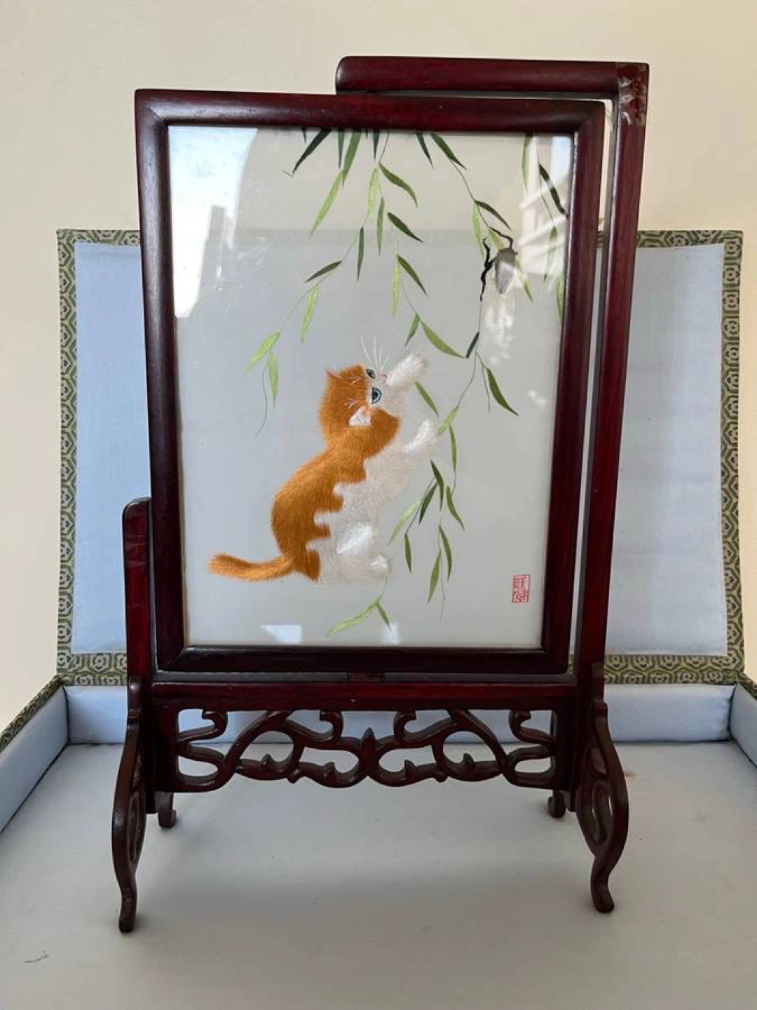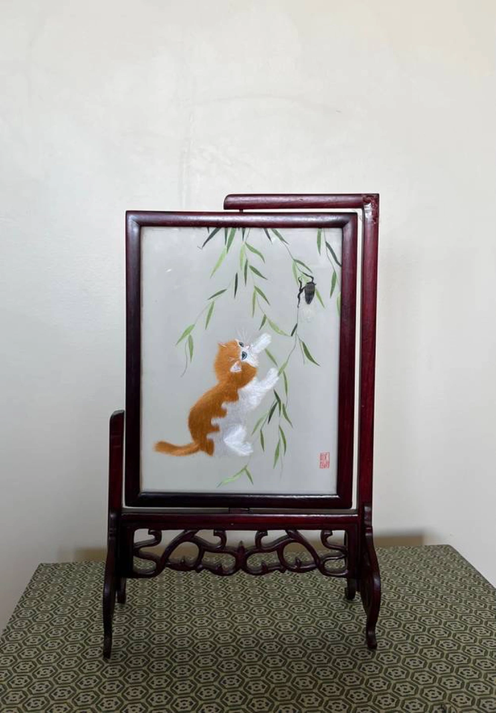 Material: Mulberry silk embroidery thread, purple light sandalwood frame, glass