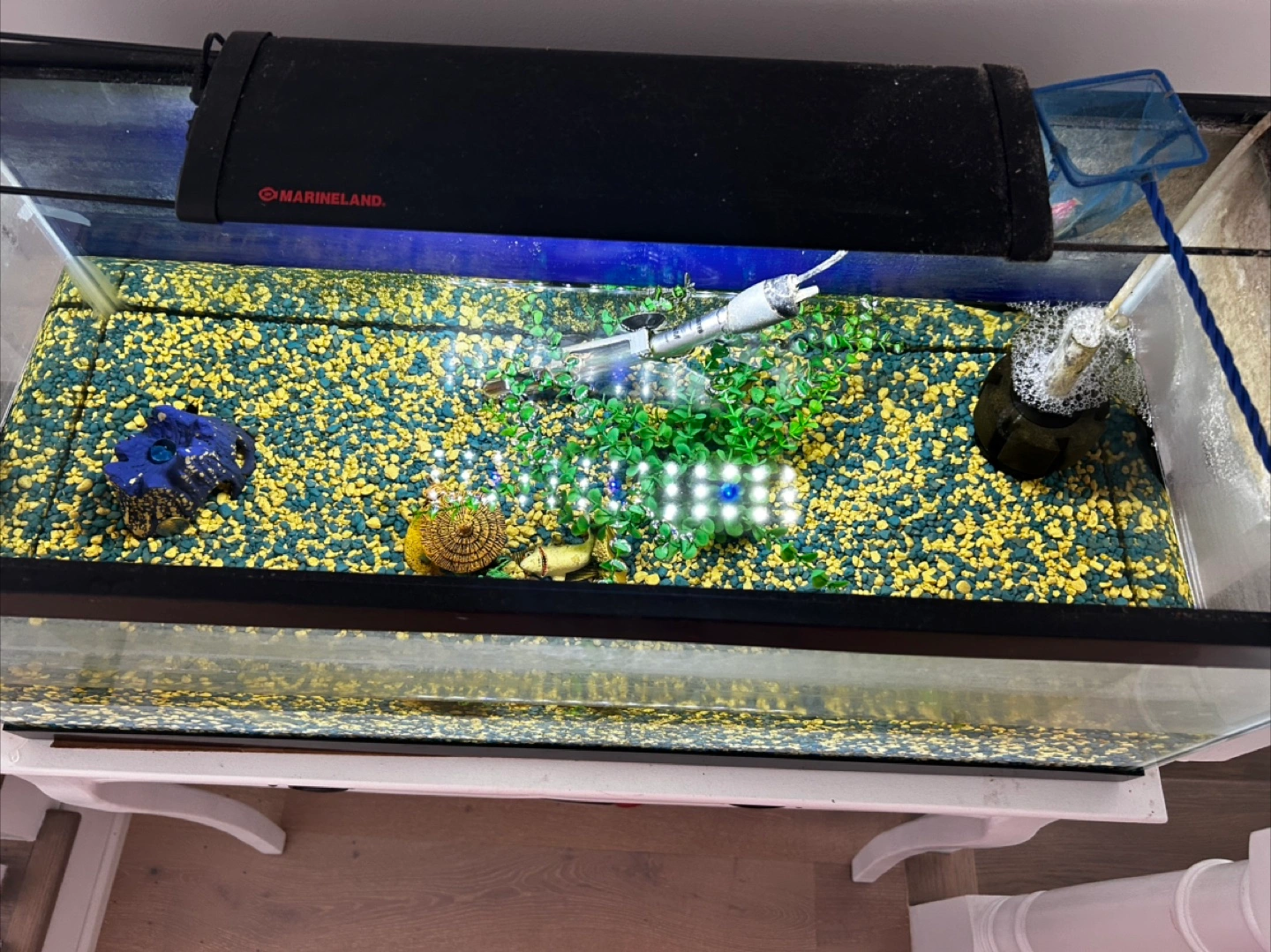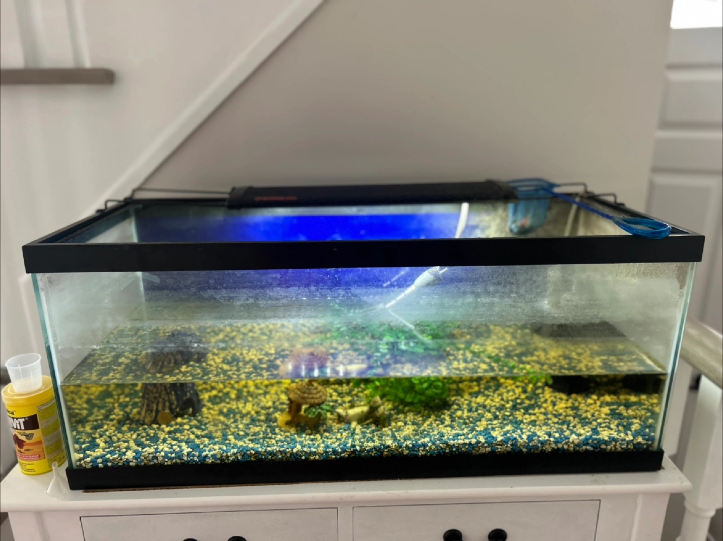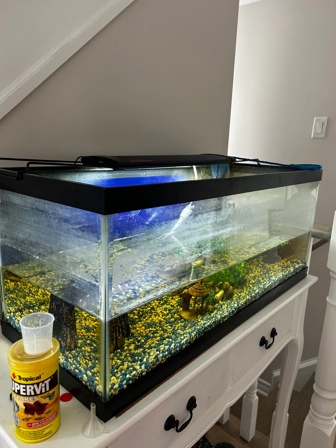 Selling a fish tank with all the accessories you need to get started! It includes gravel, decorations, a filter, and a bottle of Tropical Supervit Flakes fish food. Everything is in good condition and ready for a new home for your fishy friends