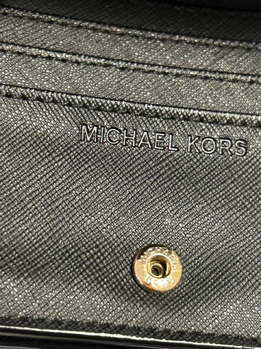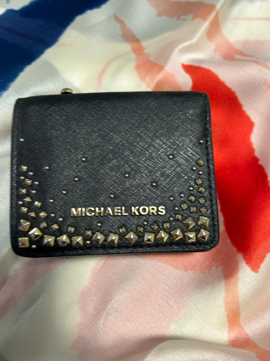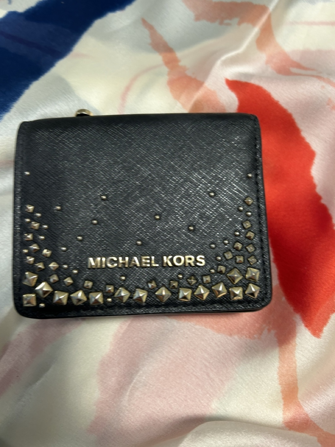 Selling a gently used Michael Kors wallet in black. It has a studded design and a convenient zip closure for coins. Inside, there are card slots and a clear ID window. Perfect for everyday use! I invite you to view my other items; if you are interested in any of them, I will give you a better price.