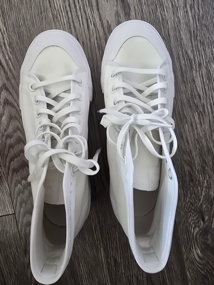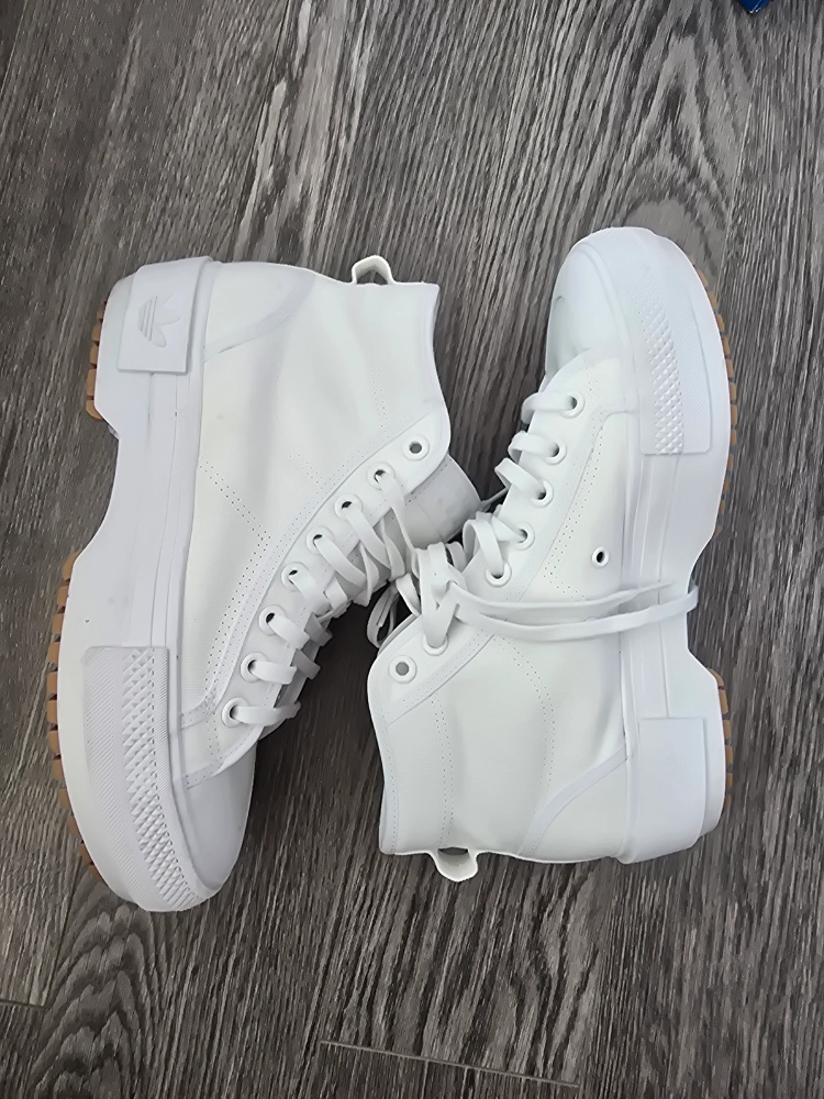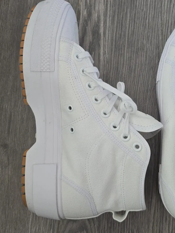 These Adidas Nizza Platform Mid sneakers are in great condition! They're a crisp offwhite colour, perfect for any outfit. The platform gives you a little extra height and style. Comes with the original box