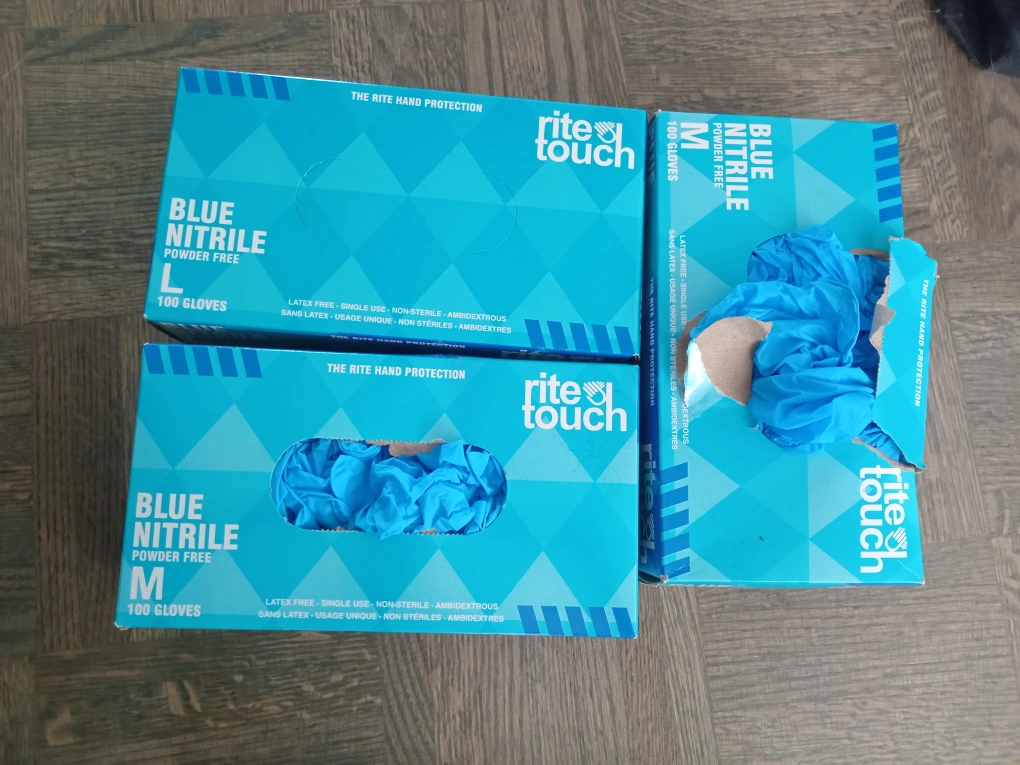 I have boxes of Rite Touch blue nitrile gloves available! There is one box in size Large (L) and two boxes in size Medium (M). They are powder-free and latex-free, suitable for single use. Each box contains 100 gloves and have more Xl gloves