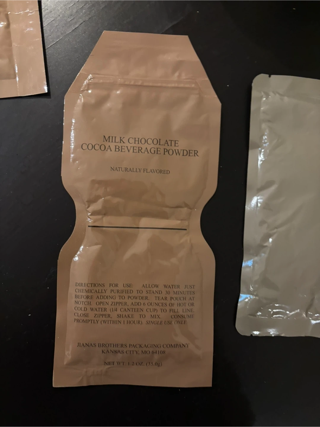 Selling a pouch of Milk Chocolate Cocoa Beverage Powder! Just add water that has been chemically purified and let it stand for 30 minutes before adding the powder. Tear the pouch at the notch, open the zipper, and add 6 ounces of hot or cold water. Close the zipper, shake to mix, and consume promptly! Net weight is 1.2 oz (35.0g)
