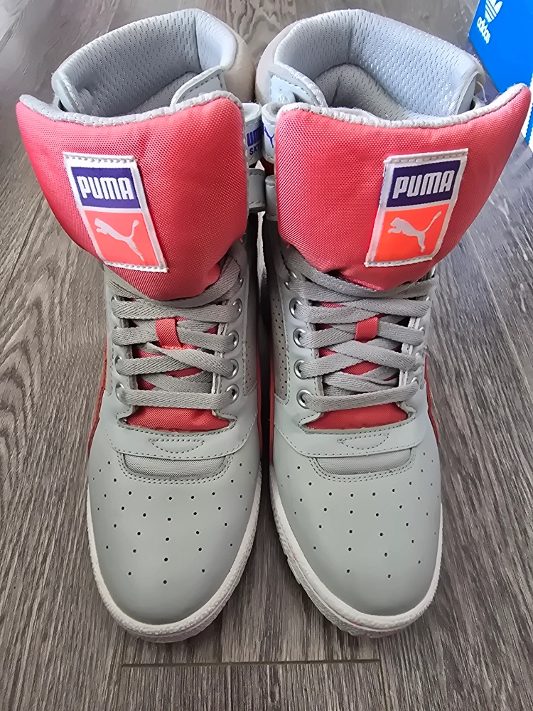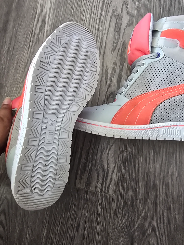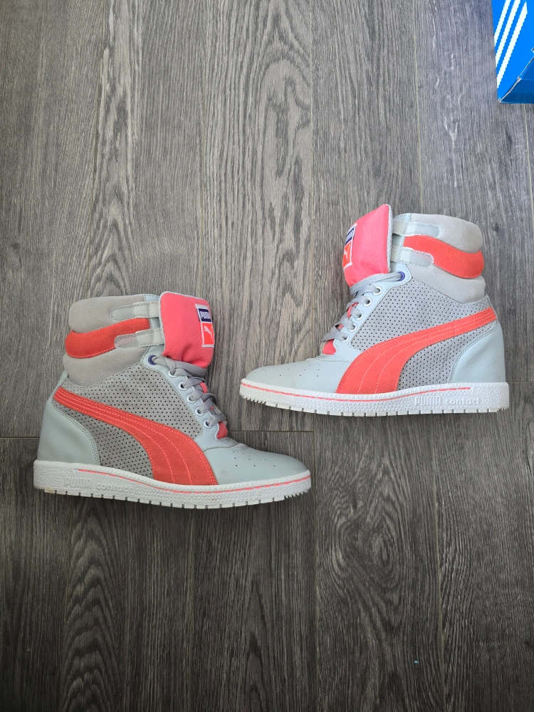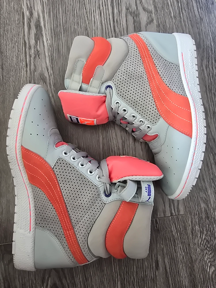 These Puma Sky LX high-top suede& leather sneakers are in great condition! They feature a stylish grey and coral colour scheme. Perfect for adding a retro touch to your outfit!