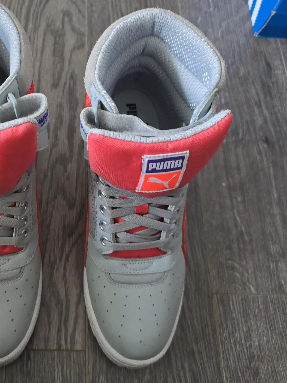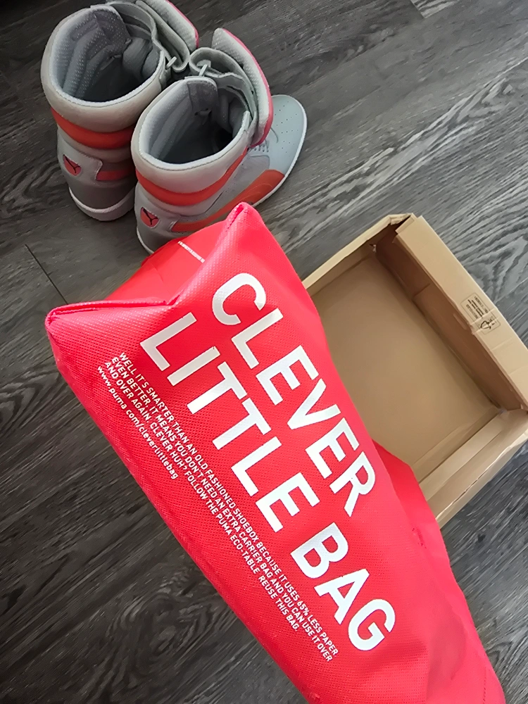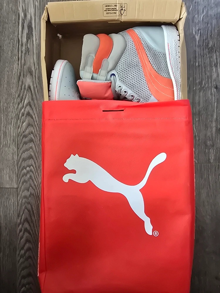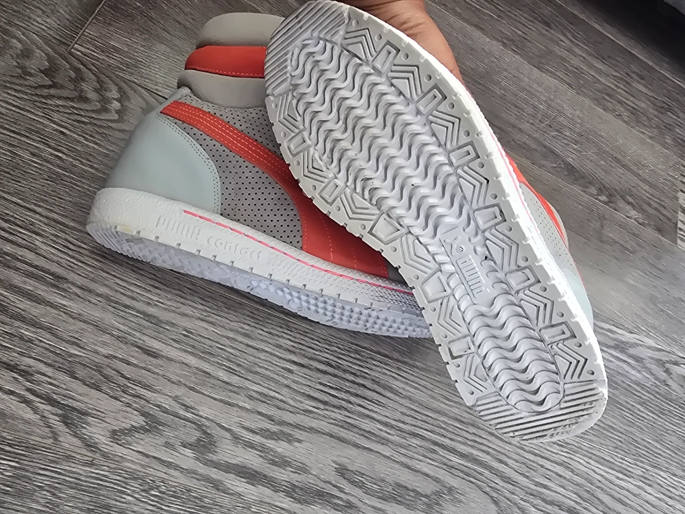 These Puma Sky LX high-top suede& leather sneakers are in great condition! They feature a stylish grey and coral colour scheme. Perfect for adding a retro touch to your outfit!