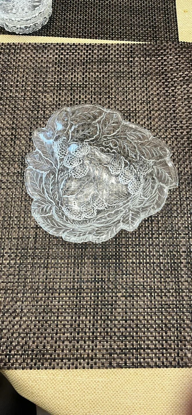 Selling a lovely decorative glass bowl! It features an intricate leaf and berry pattern, perfect for adding a touch of elegance to your home decor