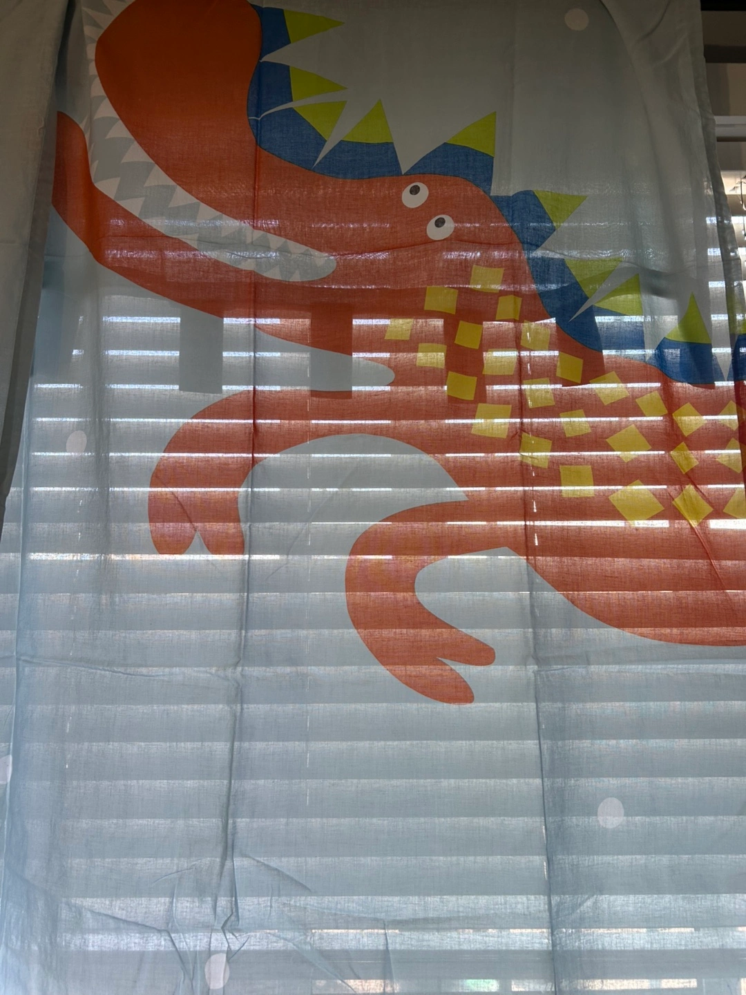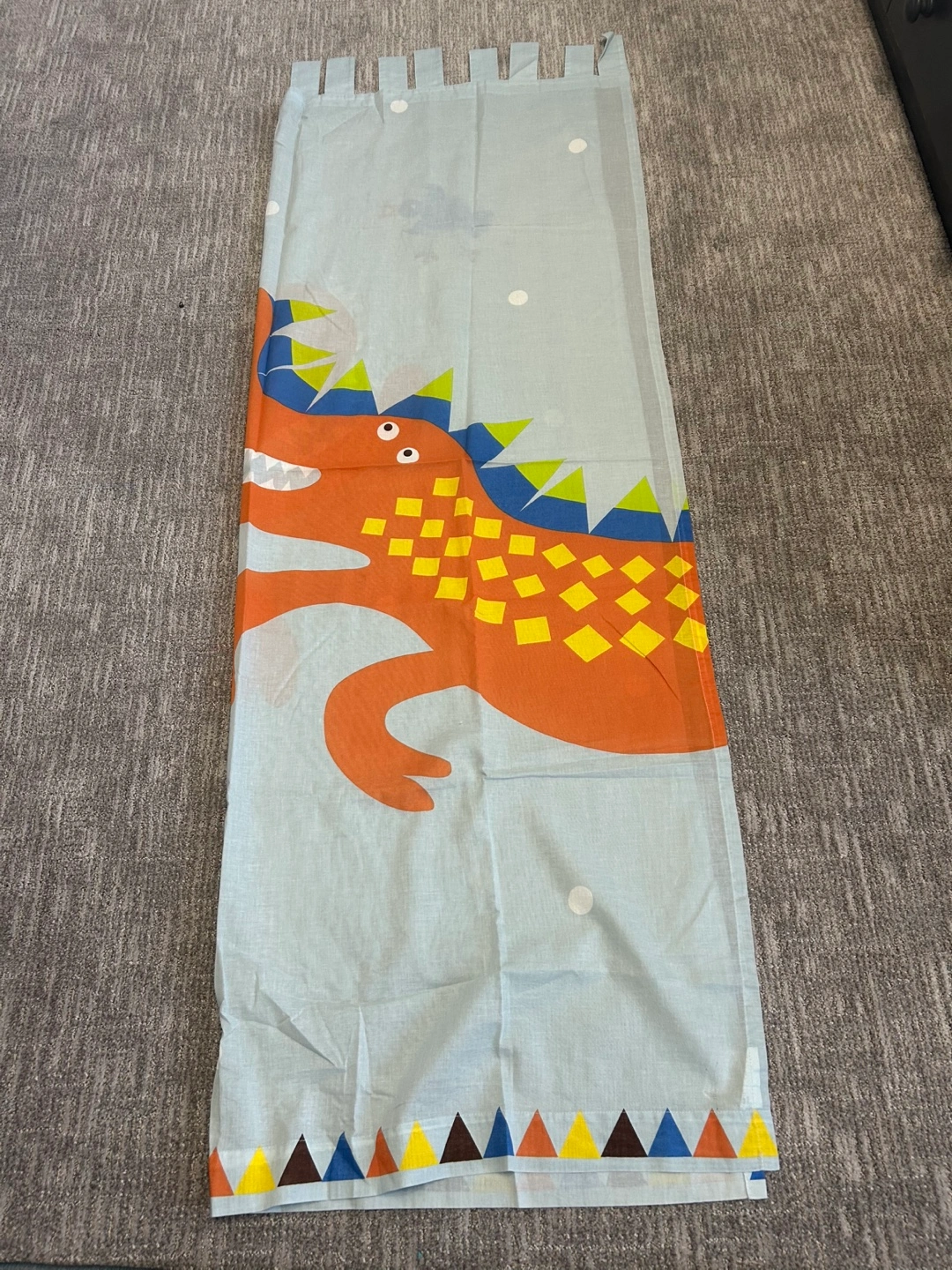 Here's a fun dinosaur print curtain for a kid's room! It features a colourful dinosaur design on a light blue background. Perfect for adding a playful touch to any space