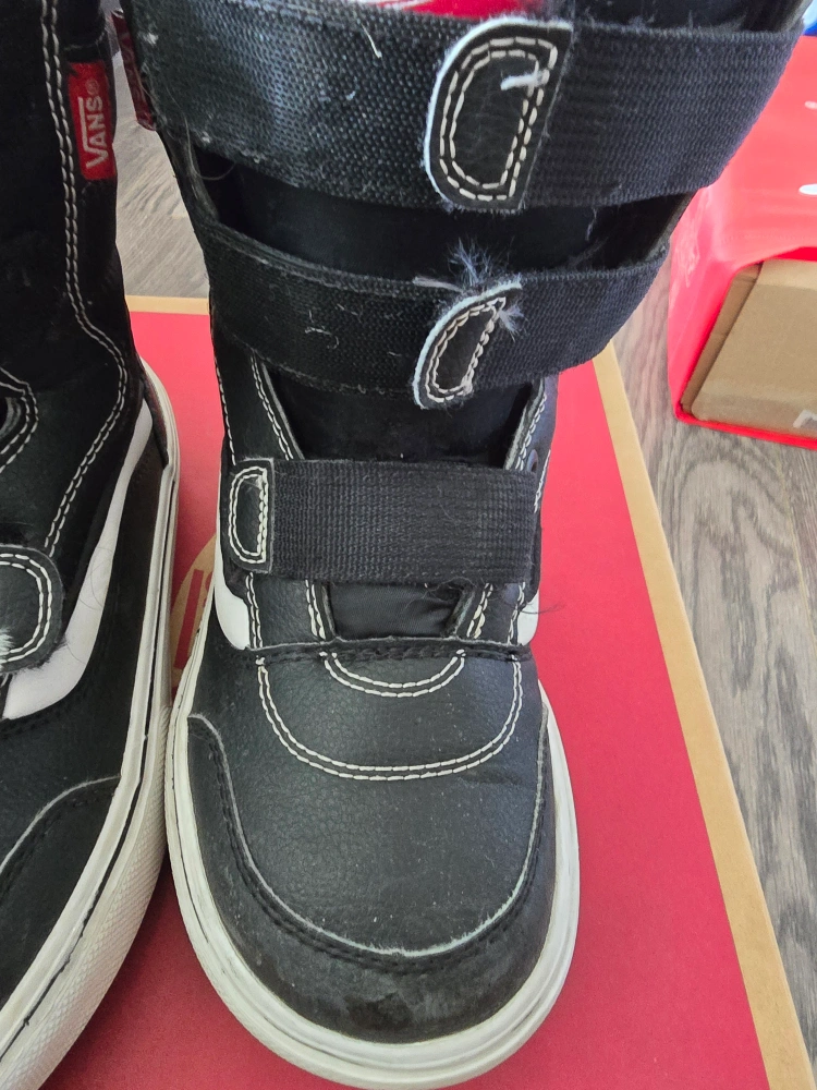 Here are some size 2 Vans snow boots, perfect for keeping your little one's feet warm and dry this winter! They feature a classic black design with white accents and the iconic Vans logo. These boots have some signs of wear, but they're still in good condition and ready for more snowy adventures