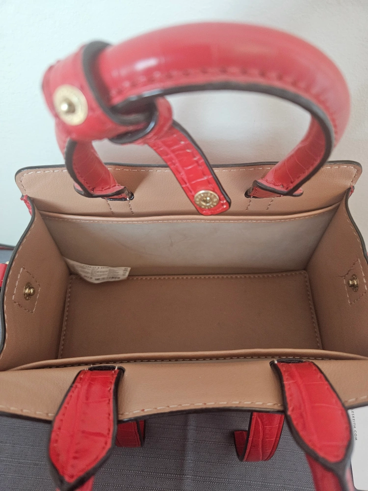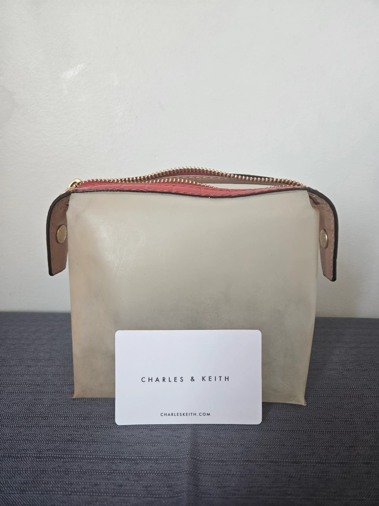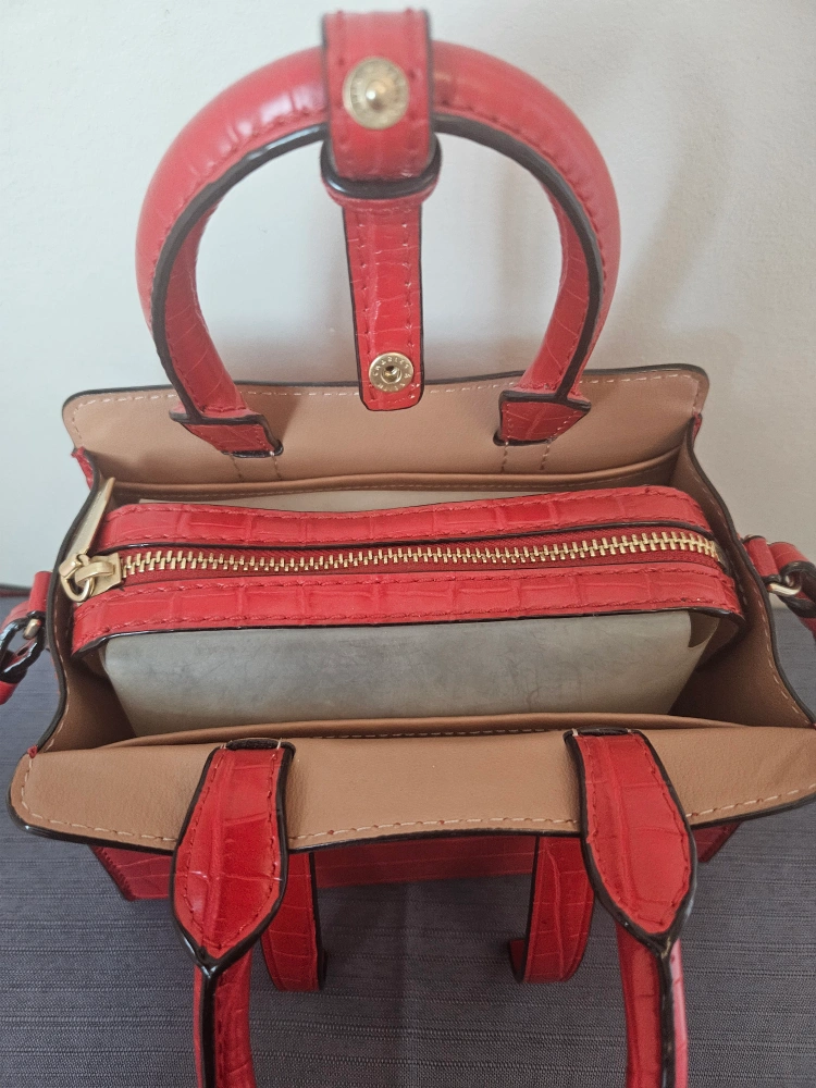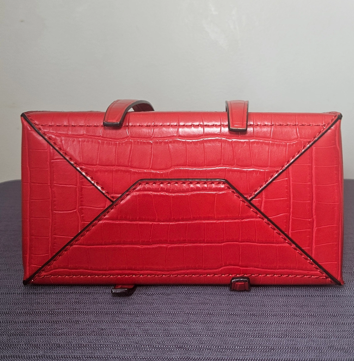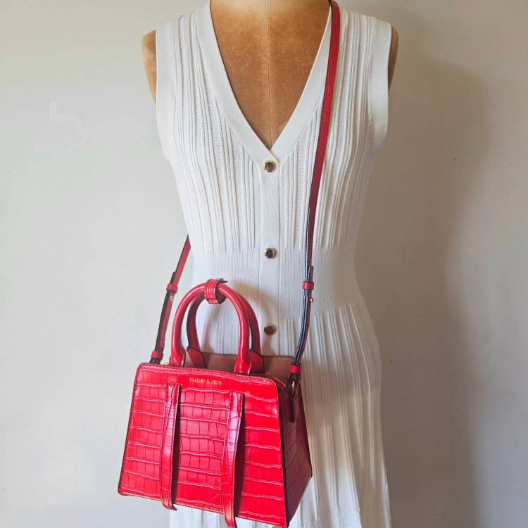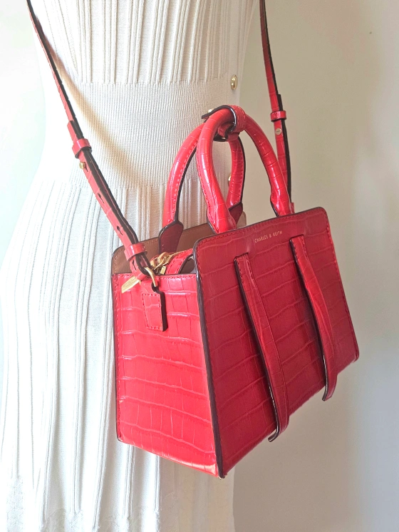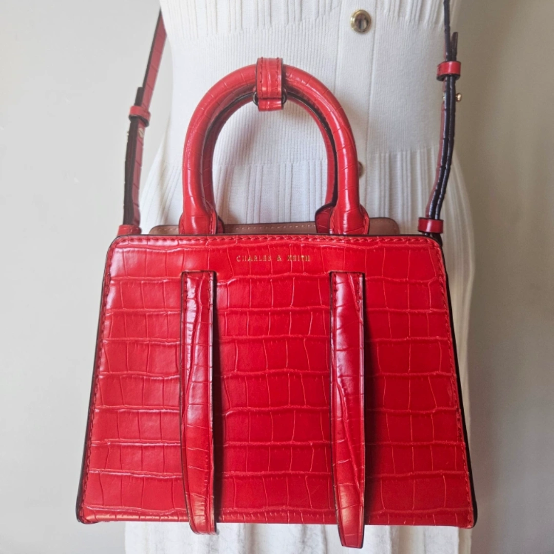 This is a Charles & Keith top handle bag in a vibrant red with a croc effect finish. It has a detachable strap and interior pocket. It's perfect for adding a pop of colour to any outfit!