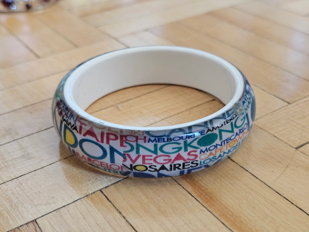 Attention travelers!!! This is a souvenir bangle bracelet. It features different cities around the world. It's in great condition and would be a nice addition to any collection
