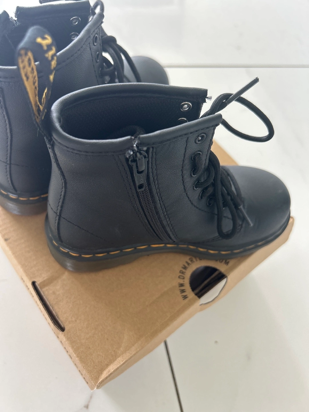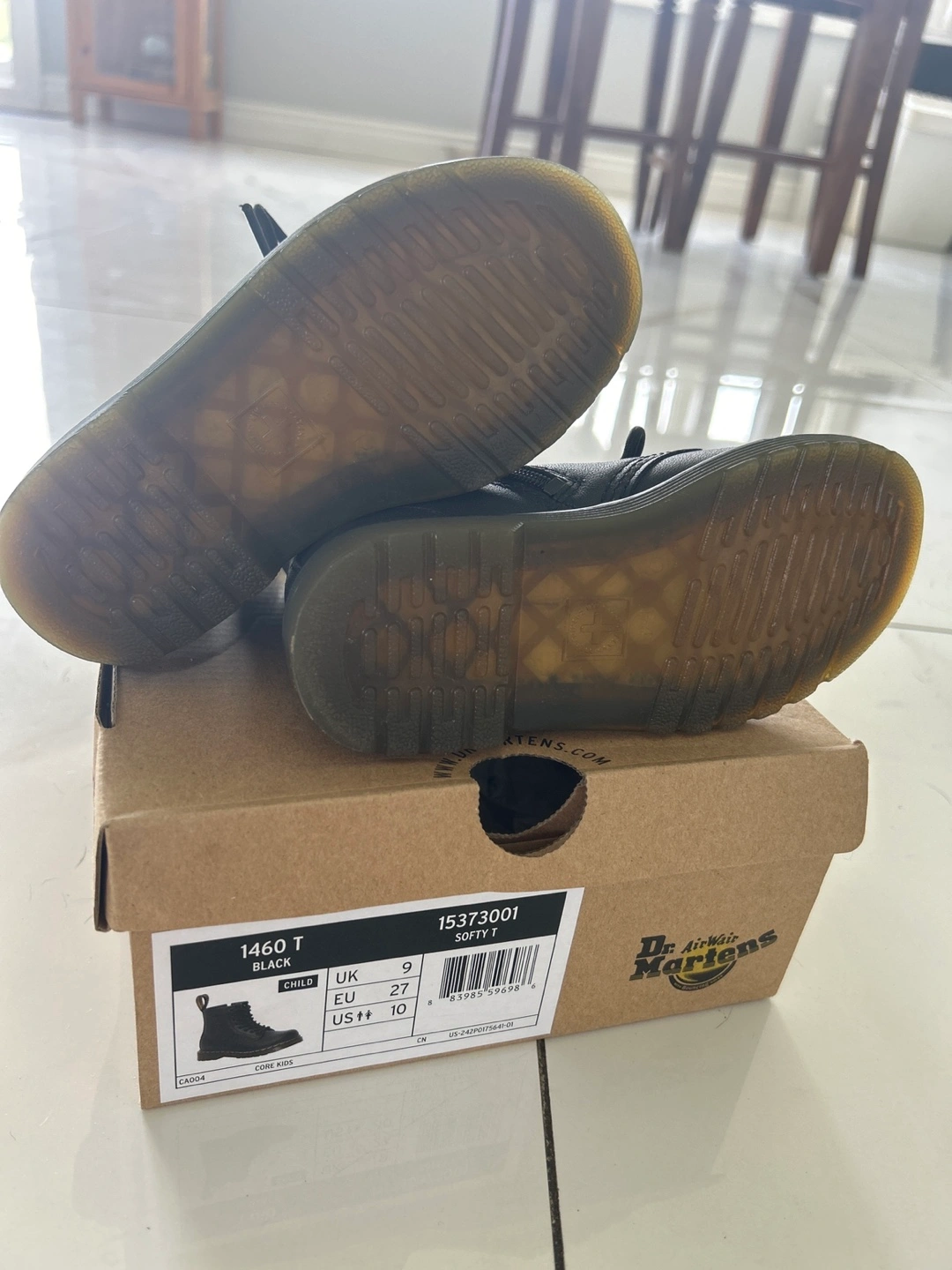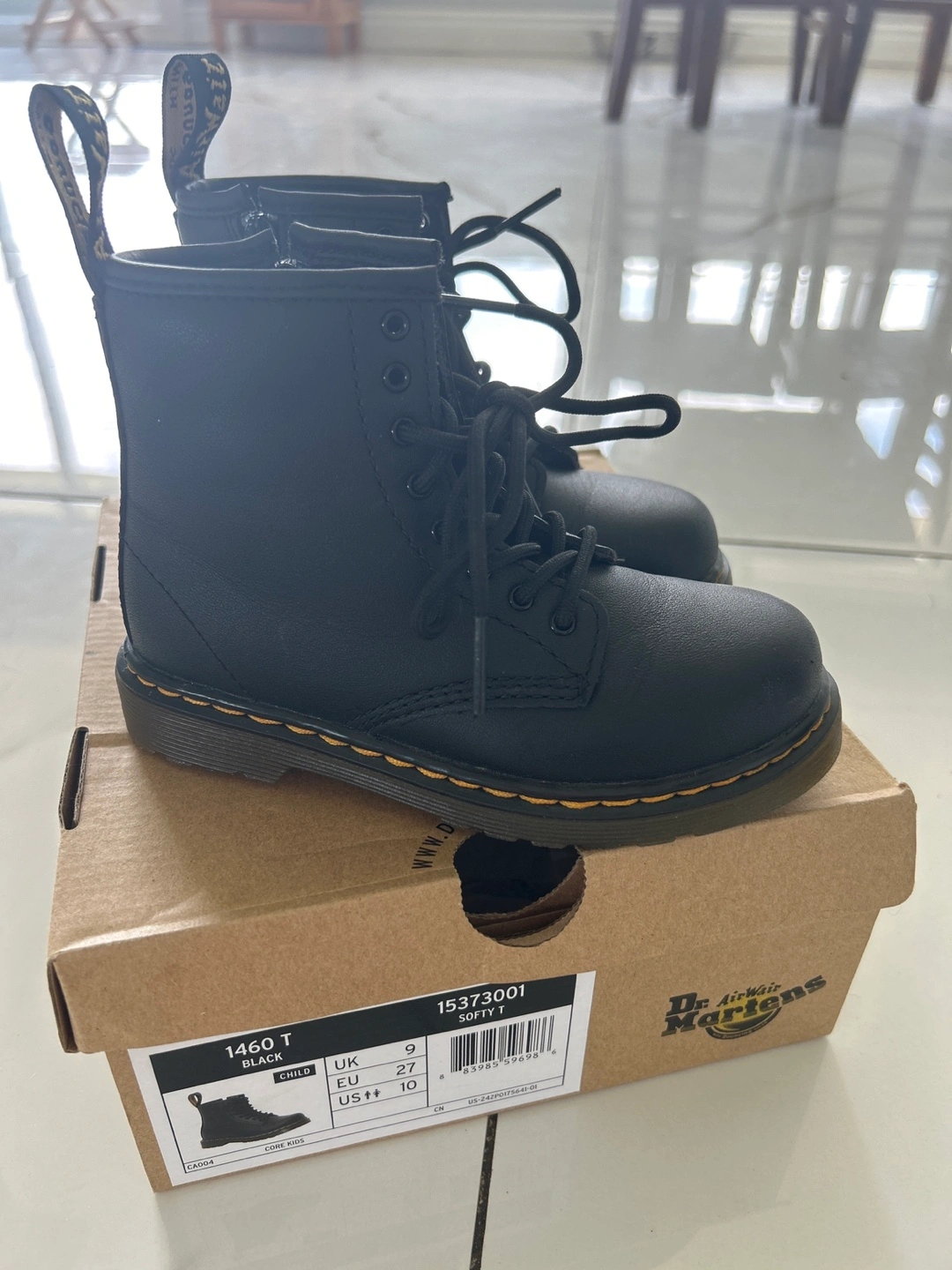 These are a pair of Dr. Martens 1460 T boots in black. They are a US size 10 for children. They come with the original box! My daughter wore them twice to walk into a restaurant and then told me they were too small for her. Threw away the receipt so unable to return them. I paid the original price $90 before tax. Looking for $65 but will to negotiate!