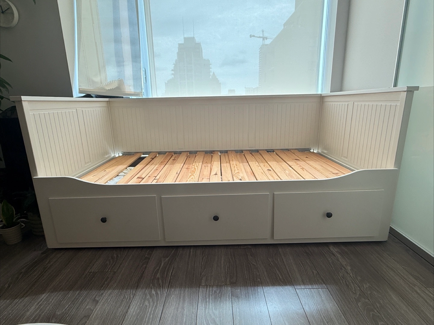 Selling an Ikea Hemnes daybed frame. It's in good condition and perfect for a guest room or small space. The frame is white with a wood slat base and features three drawers for storage. It can be used as a sofa or a bed!