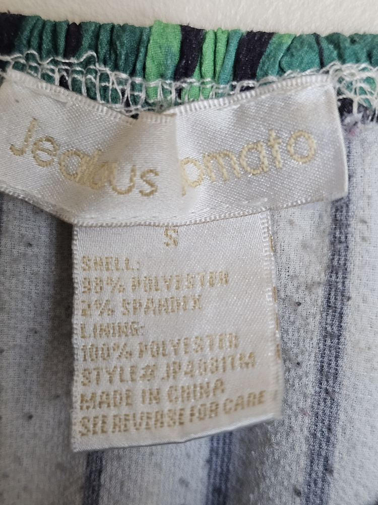 This Jealous Tomato jumpsuit is a size small and features a fun, tropical print. The shell is made of 98% polyester and 2% spandex, while the lining is 100% polyester.