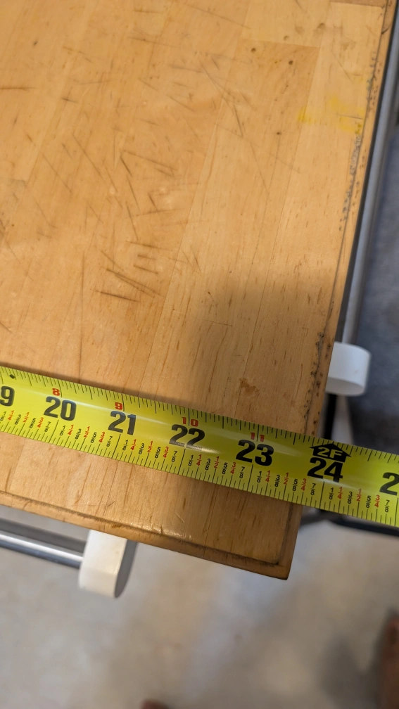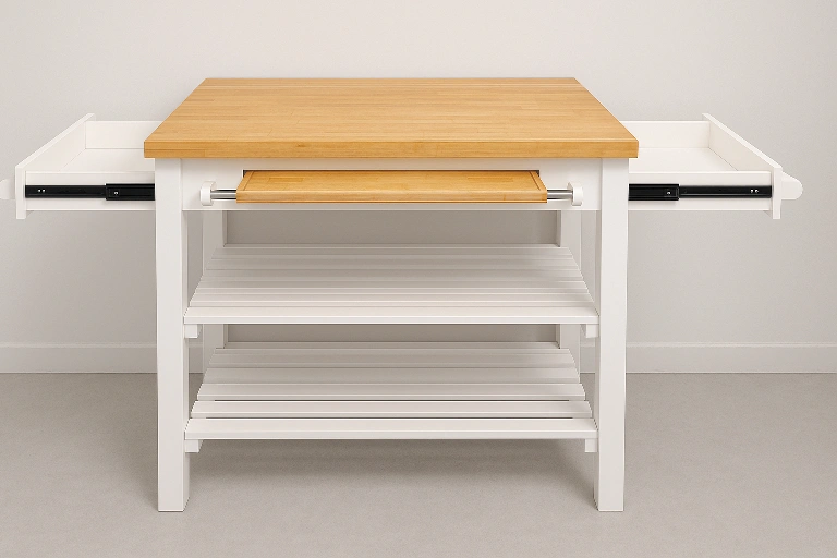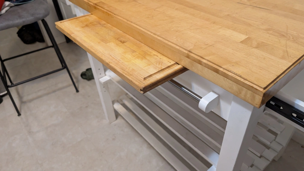 Selling a gently used IKEA Stenstorp kitchen island. It features a solid wood countertop and a white frame. The dimensions are approximately 36 inches in length and 24 inches in width. It also has a convenient pull-out cutting board and storage shelves