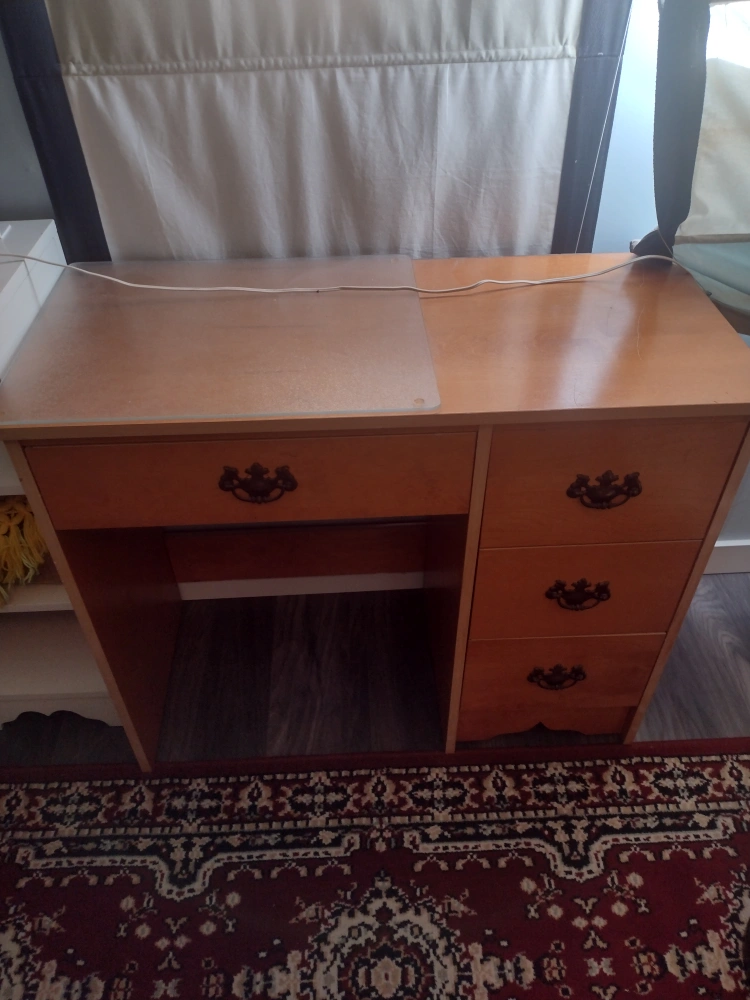 Selling a small wooden desk with 3 vertical drawers and 1 central drawer storage. It's in good condition and perfect for a home office or study space. It has a simple design that would fit well in house or apartment.