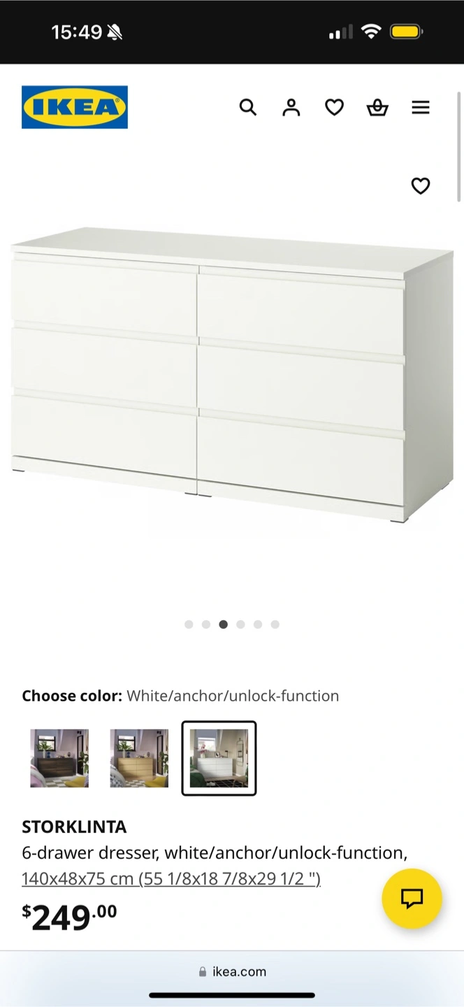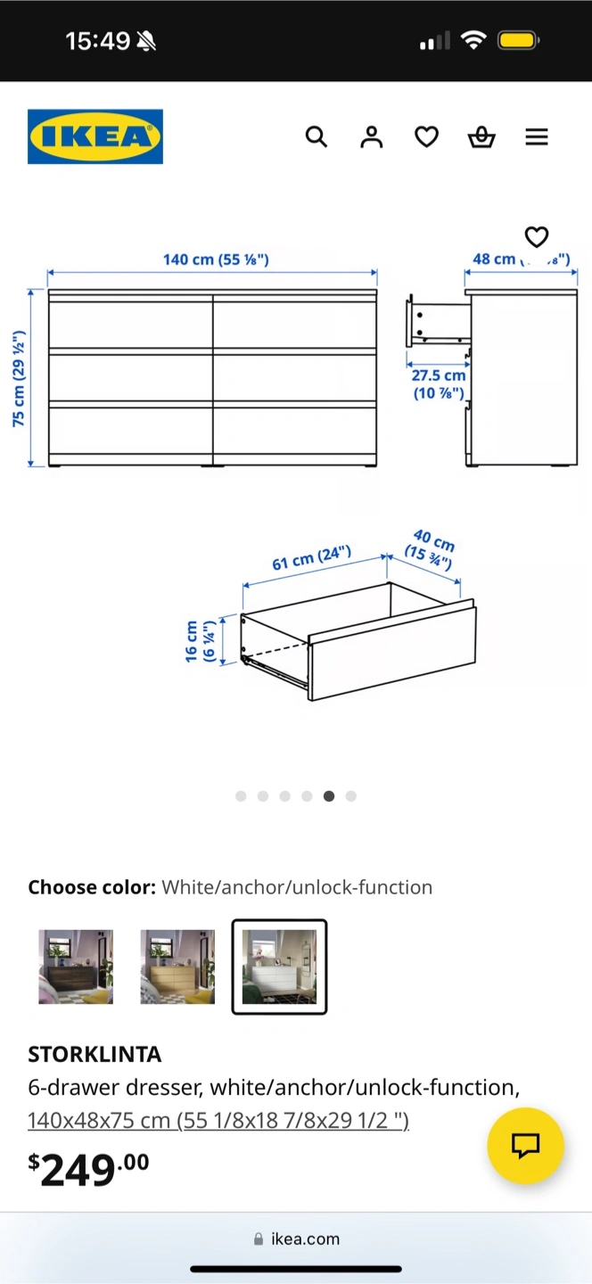 Selling an IKEA STORKLINTA 6-drawer dresser in white. It measures 140x48x75 cm (55 1/8x18 7/8x29 1/2 ").