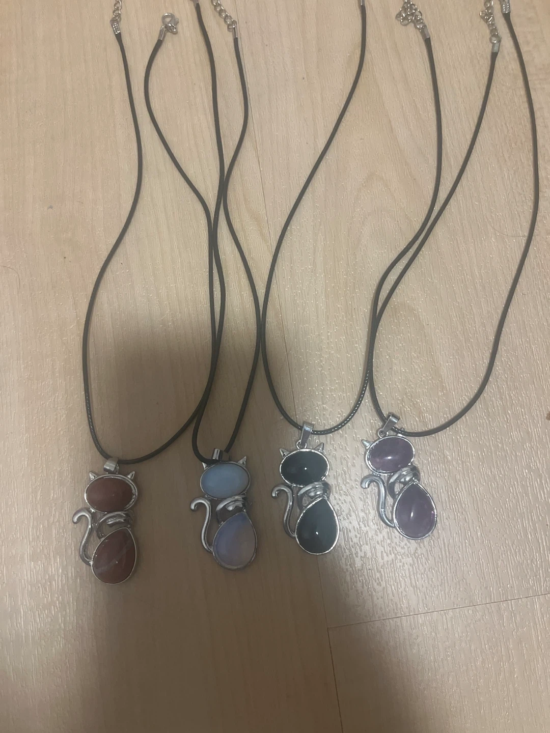 Selling a set of four cat pendants. Each pendant features a different coloured stone, set in a silver-tone metal. They're on black cords and ready to wear! Pick up only