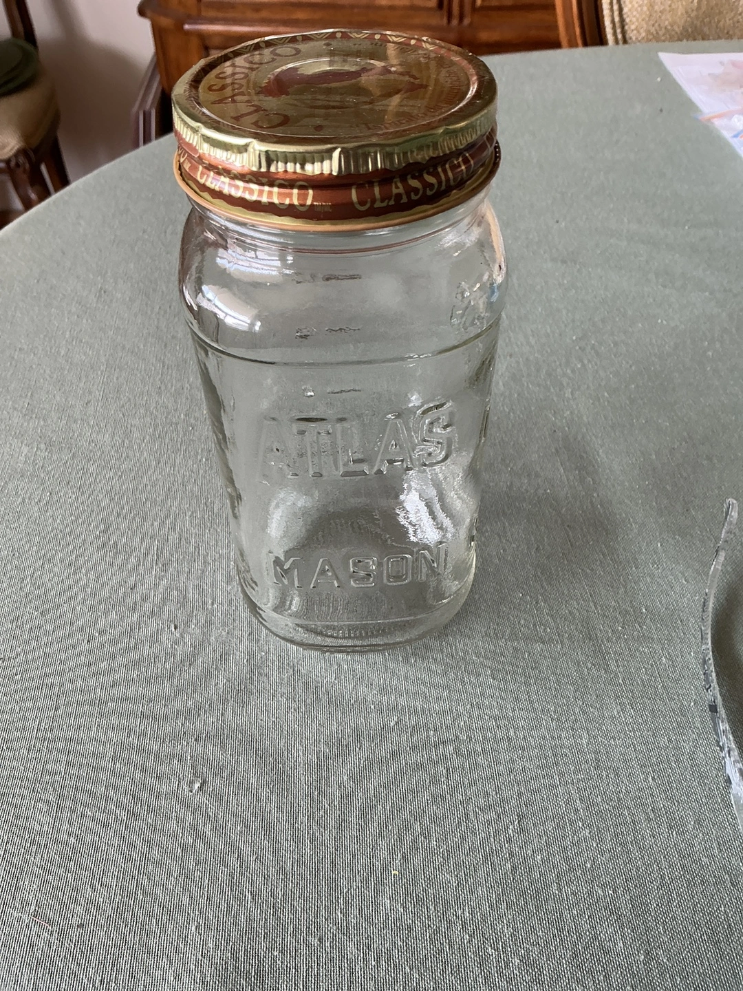Giving away 10 classic Atlas Mason jar! They are in great shape and ready for canning, storage, or decoration. The glass is clear and the lid has a nice vintage look. You may want to get new lids if canning. They were Classico sauce jars. Clean