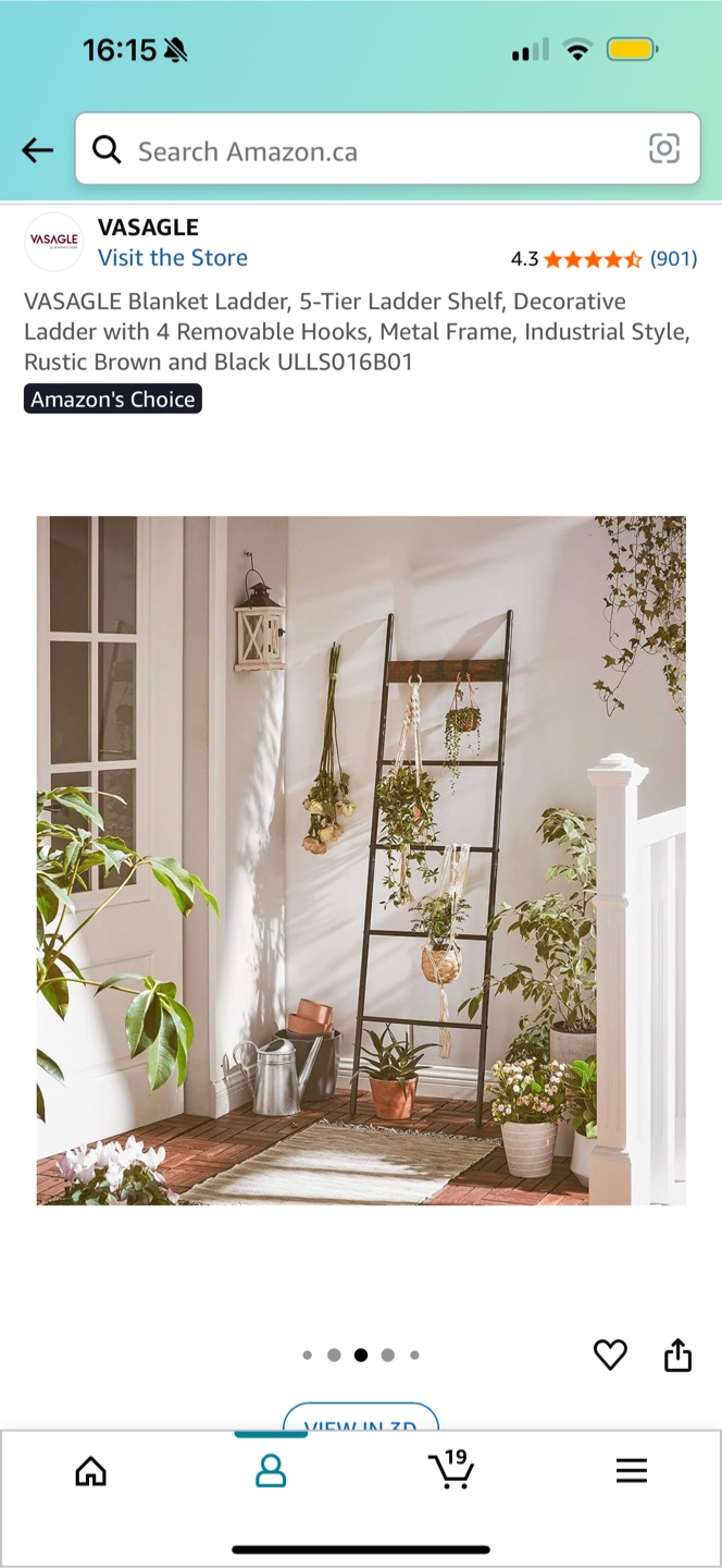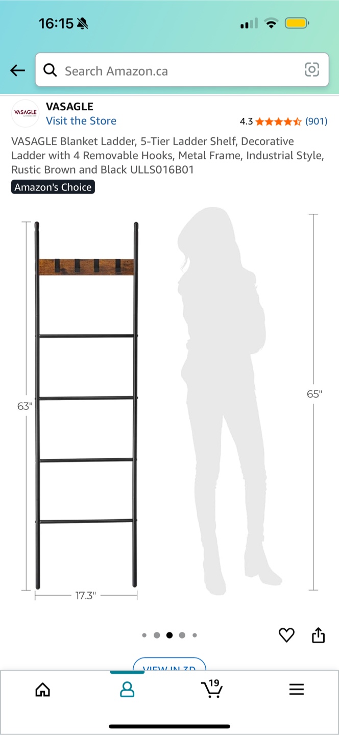 This is a VASAGLE Blanket Ladder with a 5-Tier Shelf. It also has 4 removable hooks and a metal frame. It has an industrial style with a rustic brown and black colour scheme. The dimensions are approximately 63" in height and 17.3" in width.