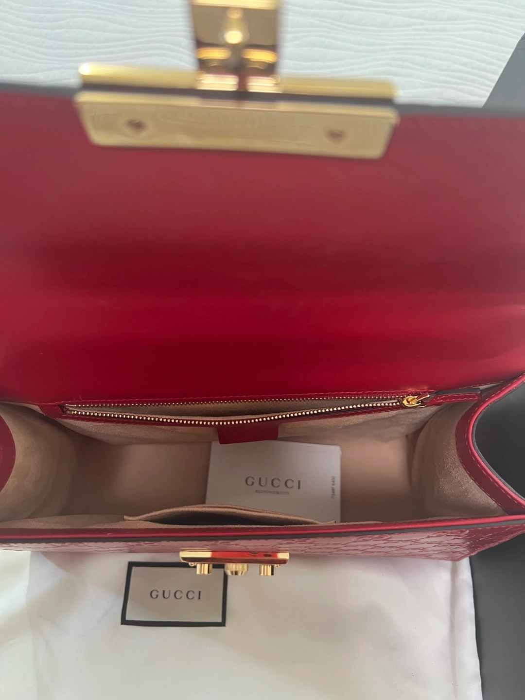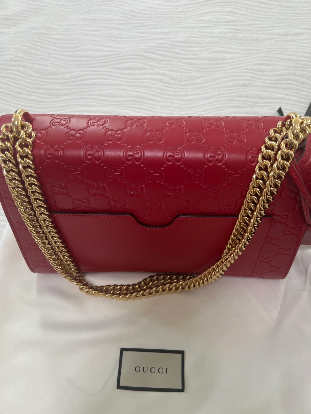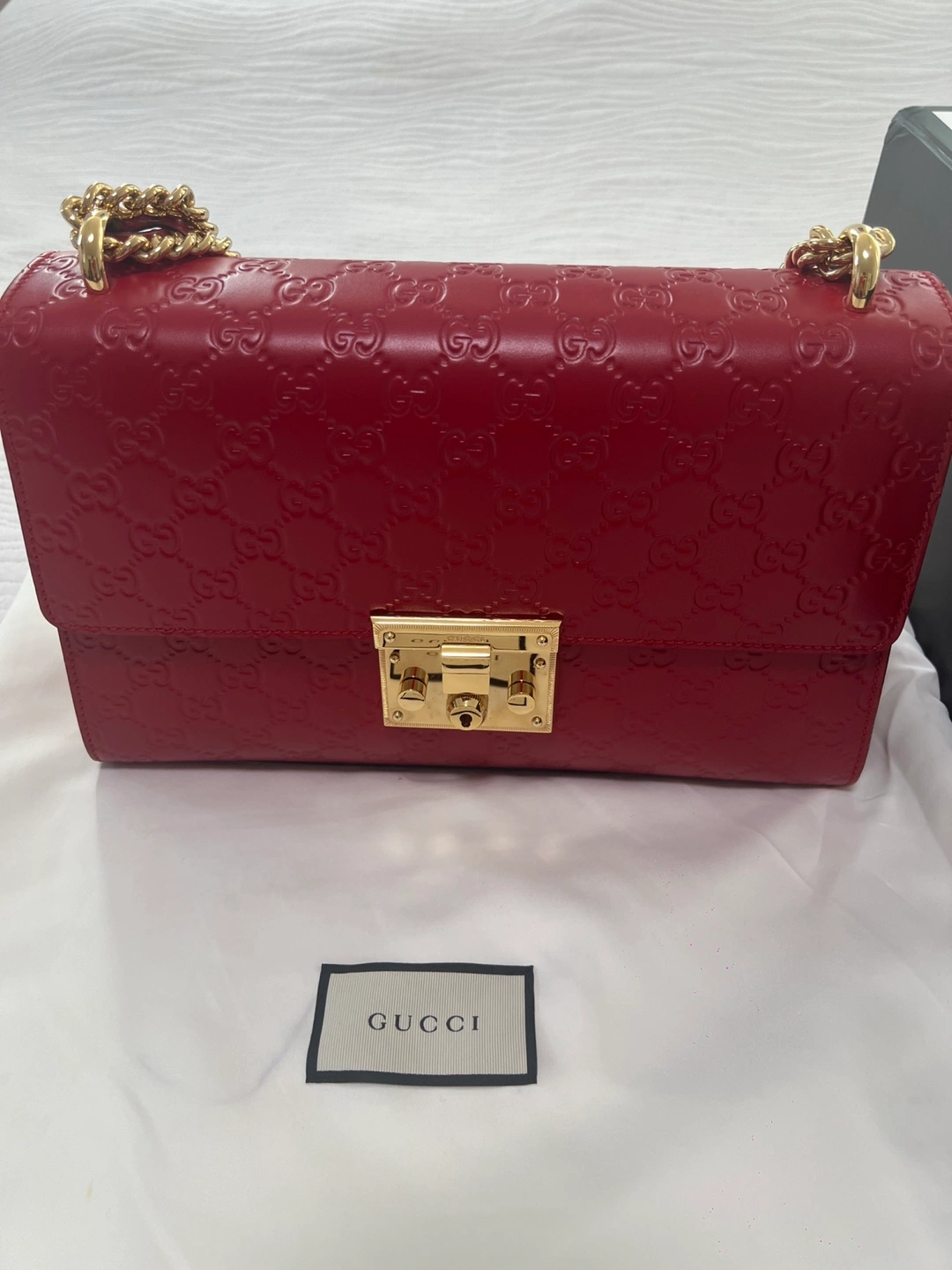 Selling a beautiful Gucci Padlock chain shoulder bag in red leather. This stylish bag features the iconic Gucci embossed pattern and a chic gold-tone chain strap. It's in great condition and comes with its original box and dust bag!