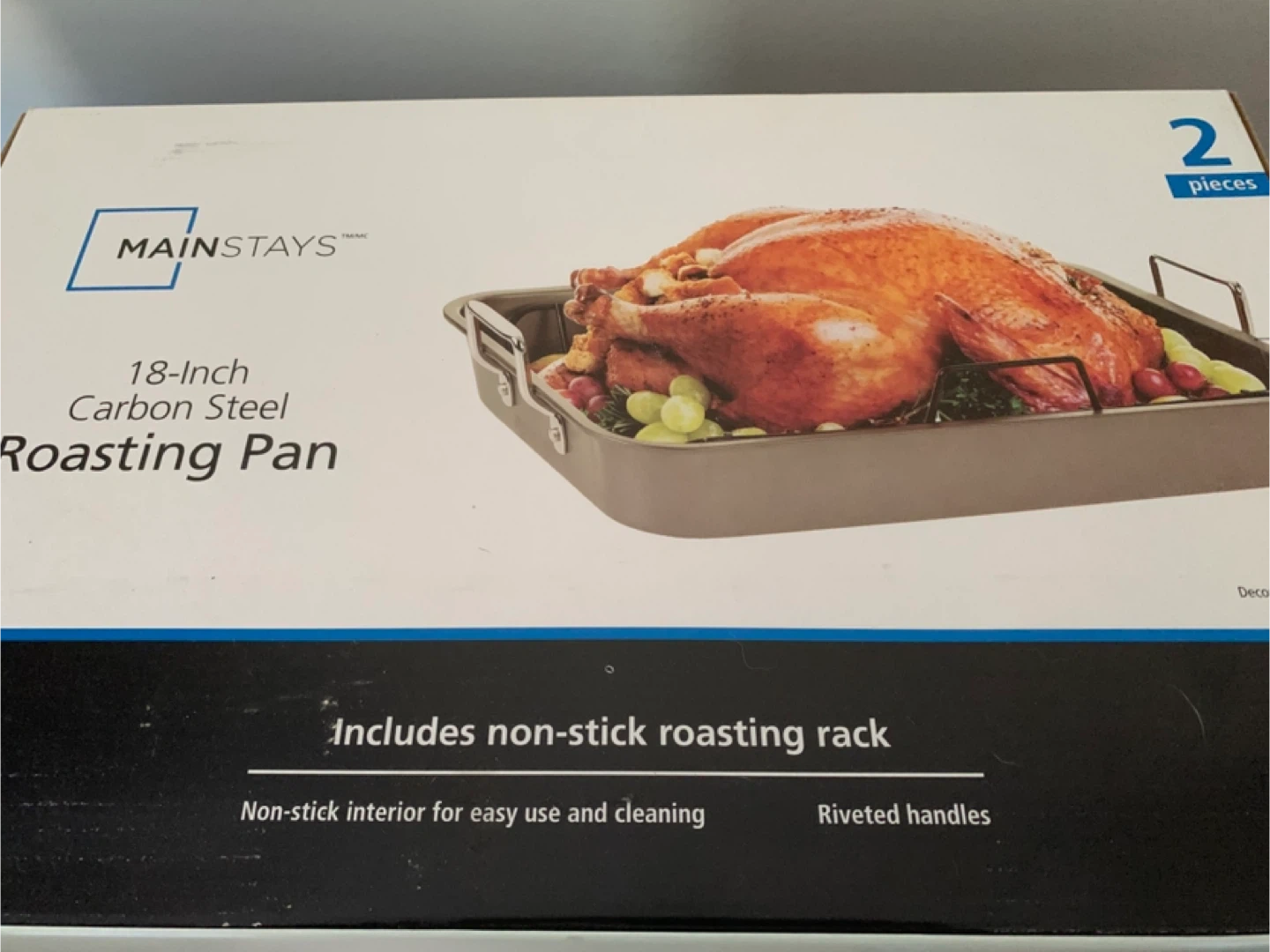 I'm selling a Mainstays 18-inch carbon steel roasting pan! It includes a non-stick roasting rack. The interior is also non-stick for easy use and cleaning, and it features riveted handles. It's a 2-piece set!