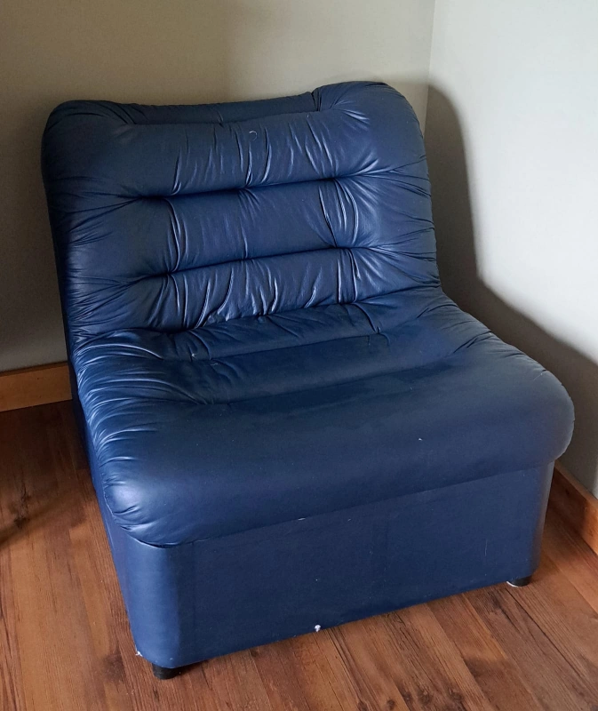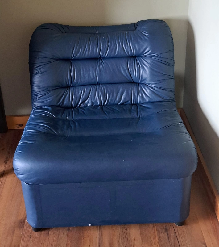 20This is a comfy blue leather armless accent chair, perfect for adding a pop of colour to your living space or bedroom! It's in great condition and ready for a new home. The leather material is durable and easy to clean. It could be used as an ottoman as well!