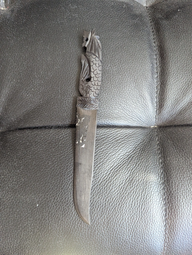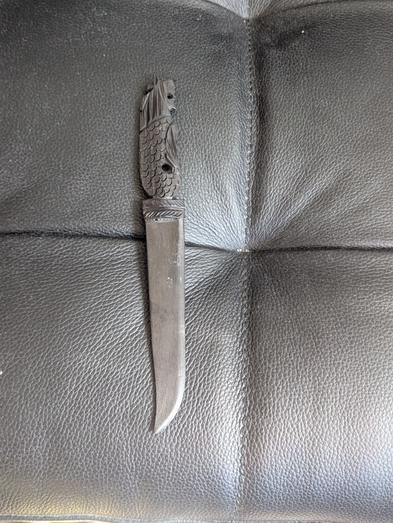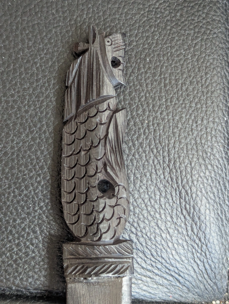 This is a unique carved wooden letter opener. The handle features a detailed fish design. It is in good condition. A cool piece for collectors!