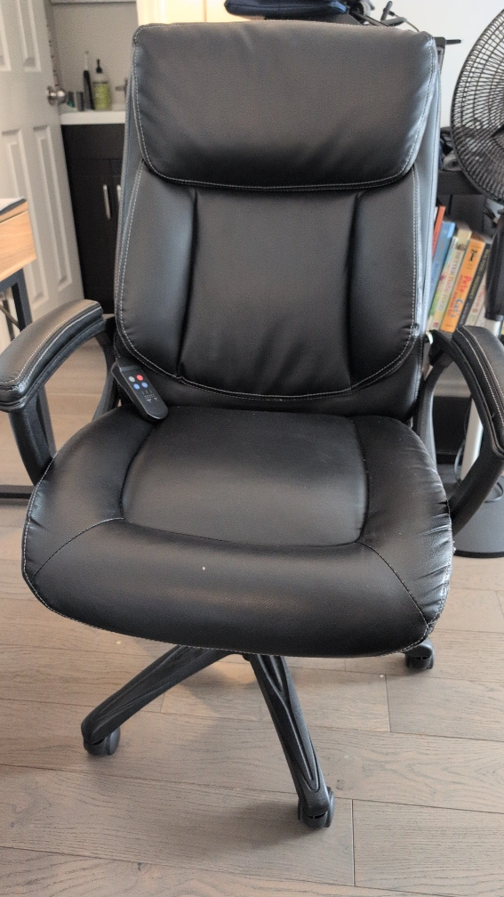 Selling a comfortable black office chair with built-in heat and massage features. It's perfect for long workdays! The chair has different massage modes and intensity levels. Great for relaxing while you work or study