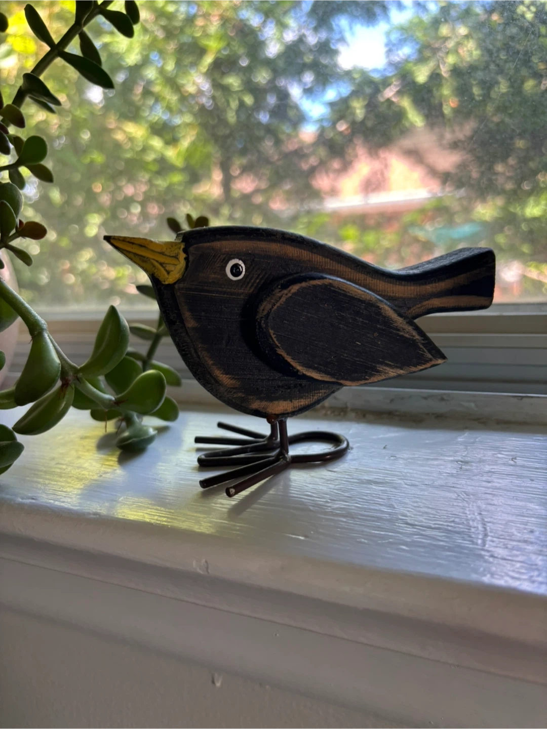 Here's a charming wooden bird figurine, perfect for adding a touch of nature to your home decor! It has a rustic, hand-carved look and would look great on a shelf or windowsill
