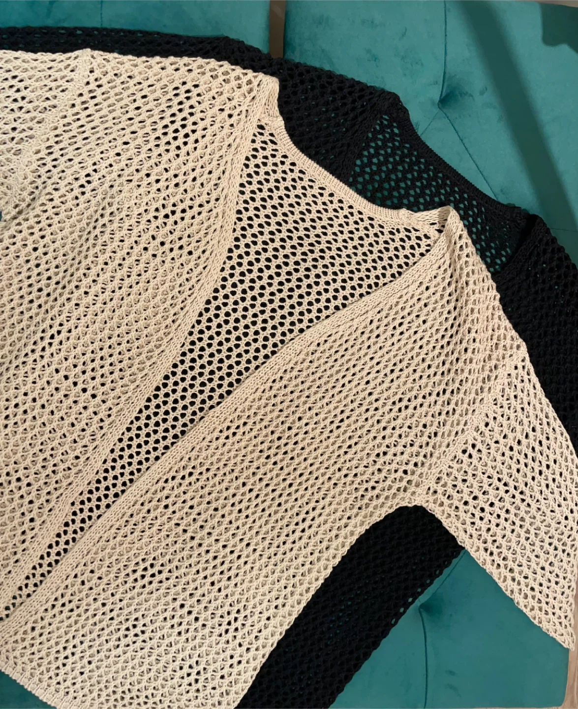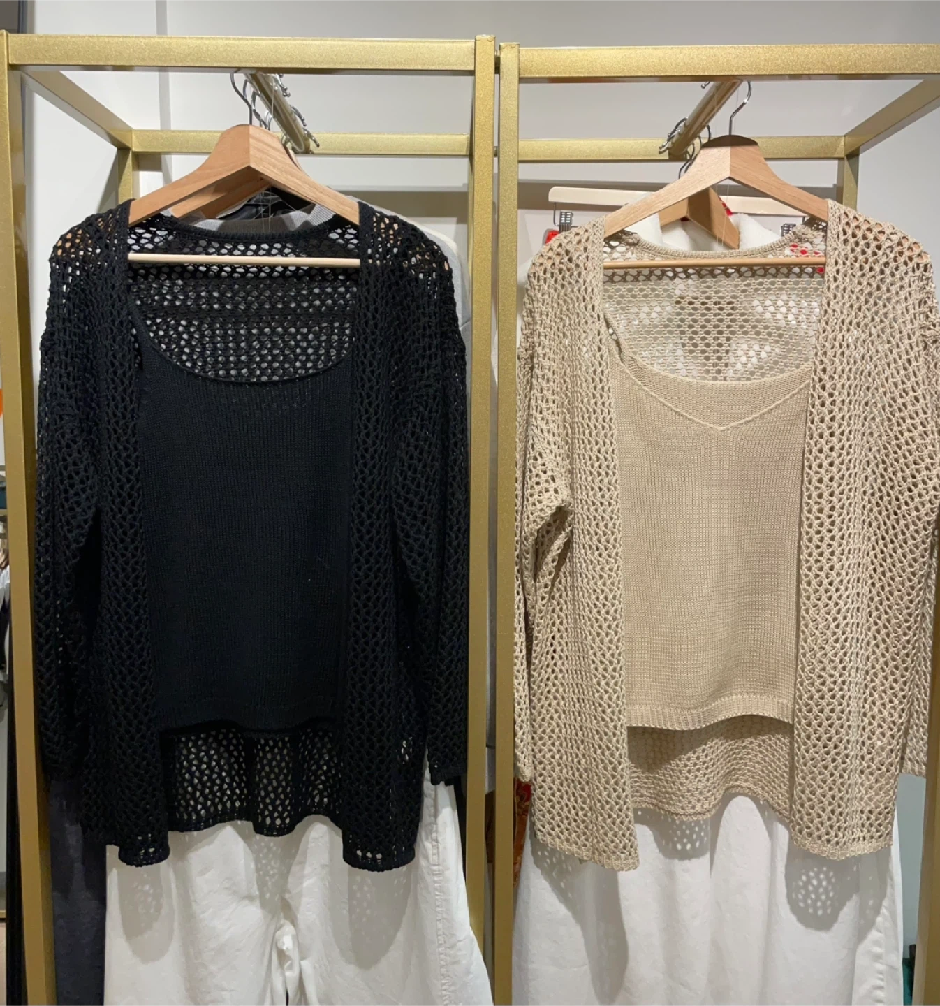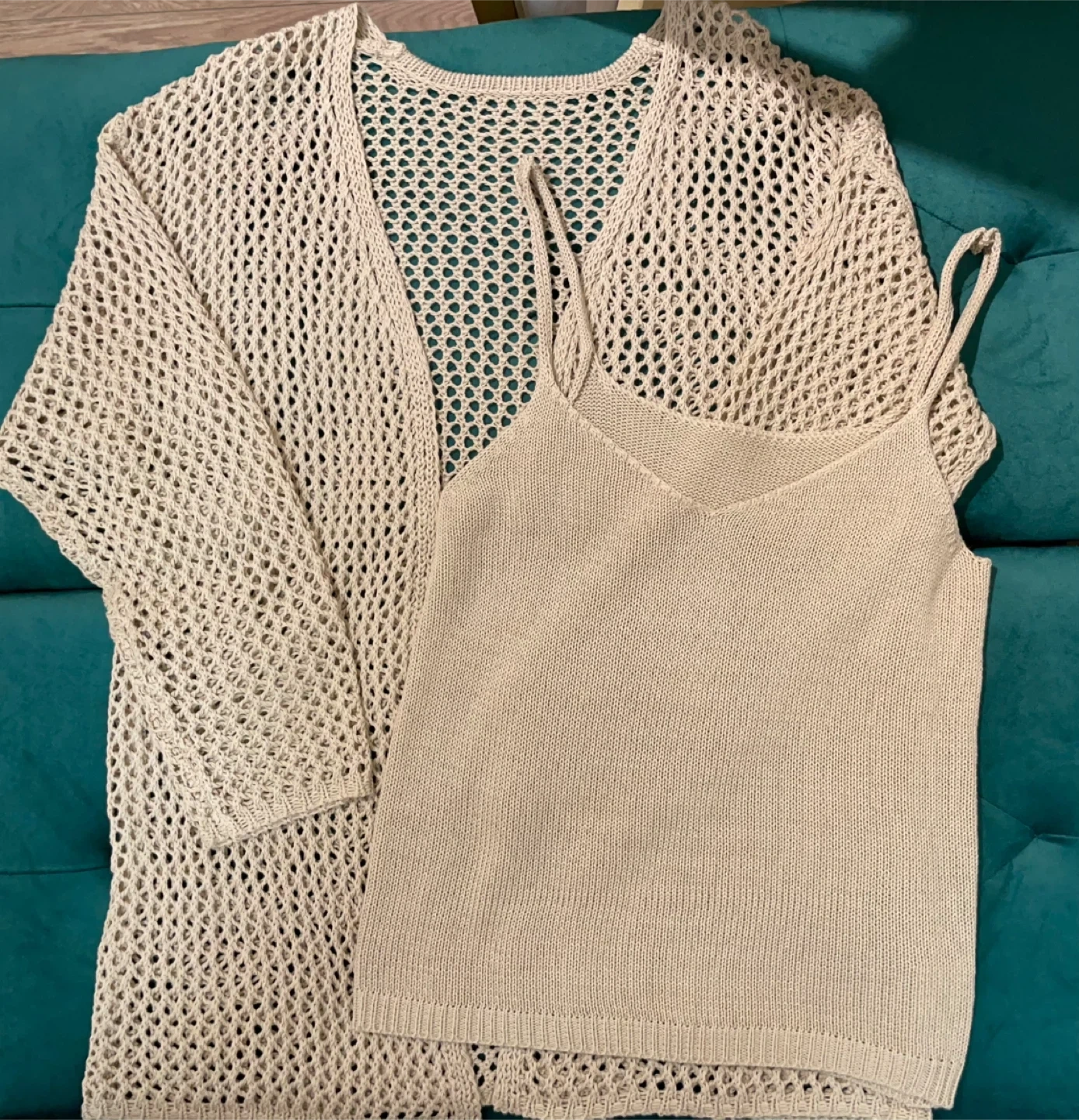 Selling a cute crochet cardigan and tank top set! Perfect for layering or wearing on its own during warmer weather. Available in both beige and black. The material is lightweight and breathable, making it super comfy for everyday wear
