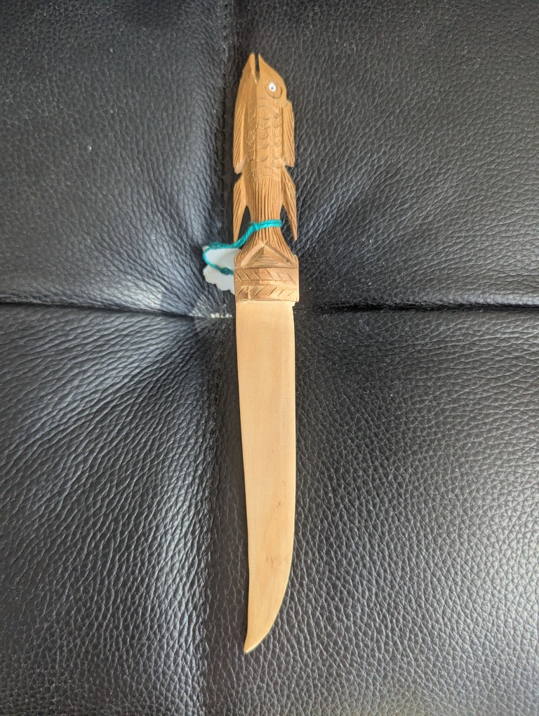 1000+This is a hand carved wooden letter opener featuring a fish design. It's a unique piece that would look great on any desk