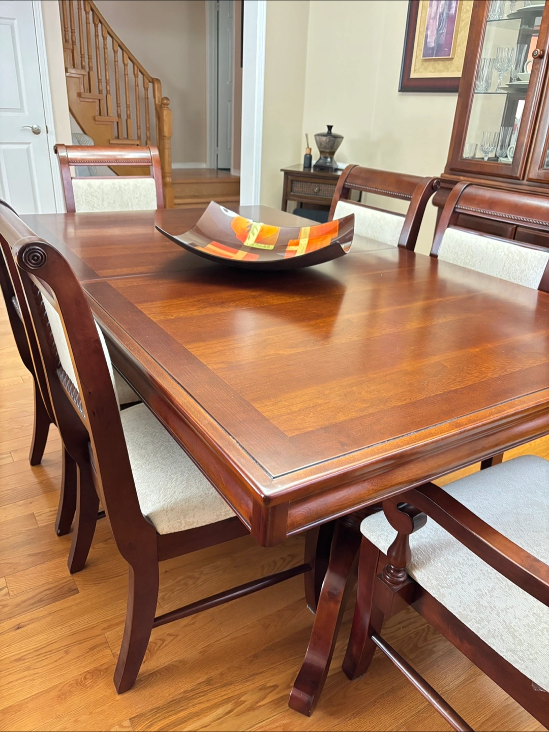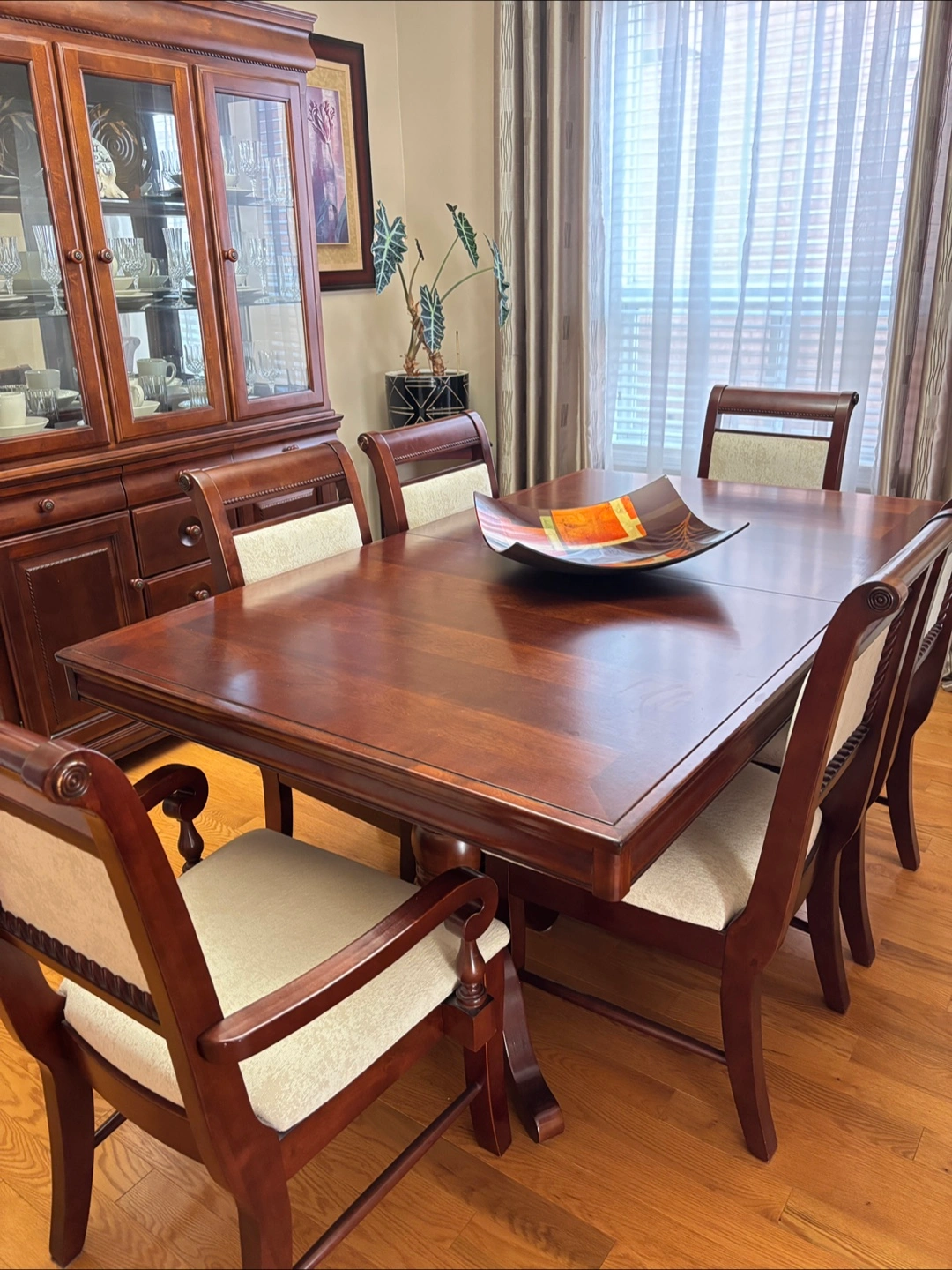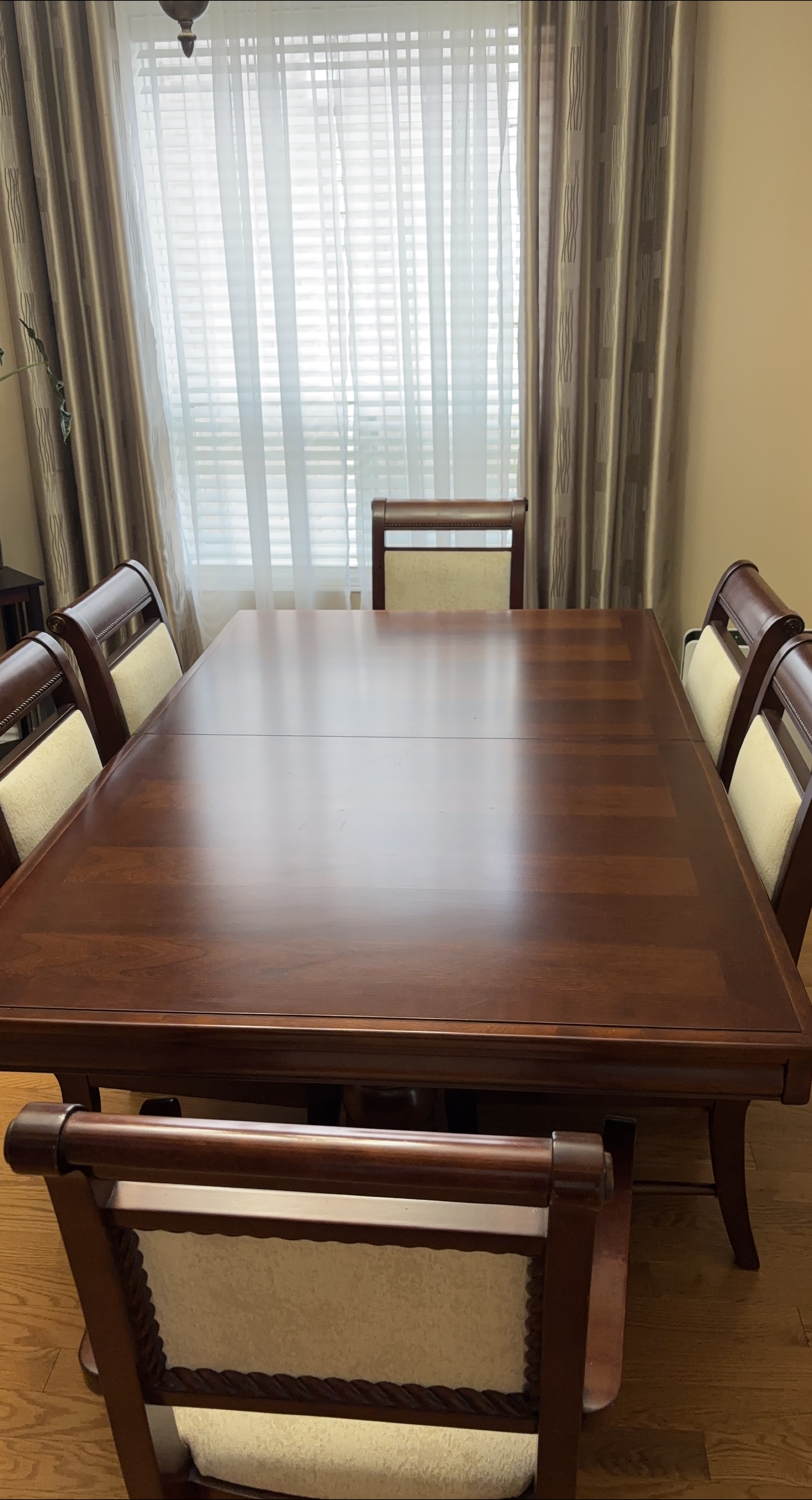 Moving Sale ๐ Elegant dining table with eight chairs. The table is a dark wood colour and is in excellent condition. The chairs have a decorative rope design around the seat backs. 6 chairs in photos(there are a chairs in total). Perfect for a big family or anyone who likes to host dinners!