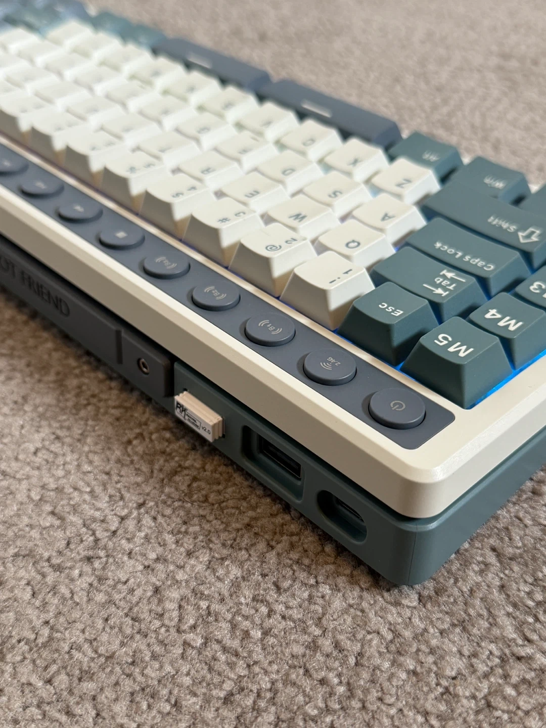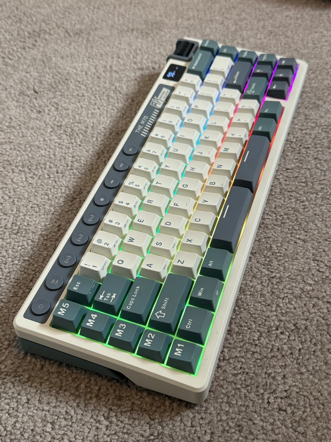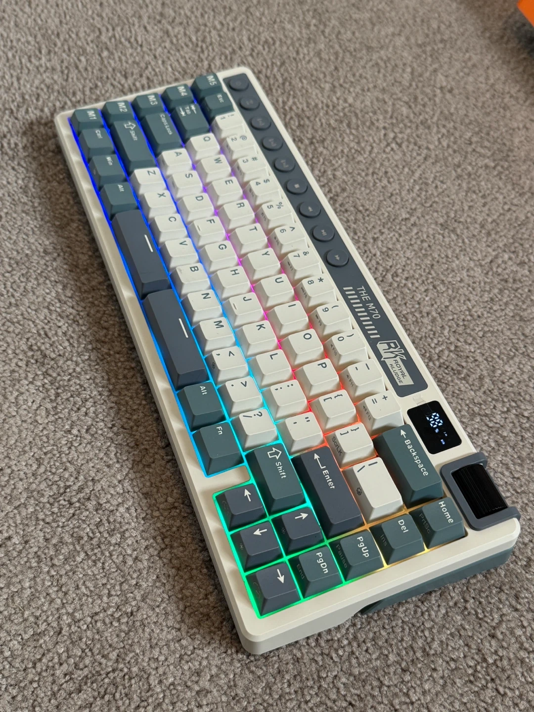 Selling a Royal Kludge RK M70 mechanical keyboard. It's in great shape and ready for a new home! The keyboard features a unique design with a mix of grey, white, and blue-grey keycaps, and RGB backlighting for a cool aesthetic. It also has a variety of function keys and a compact layout.