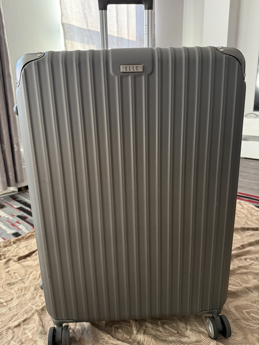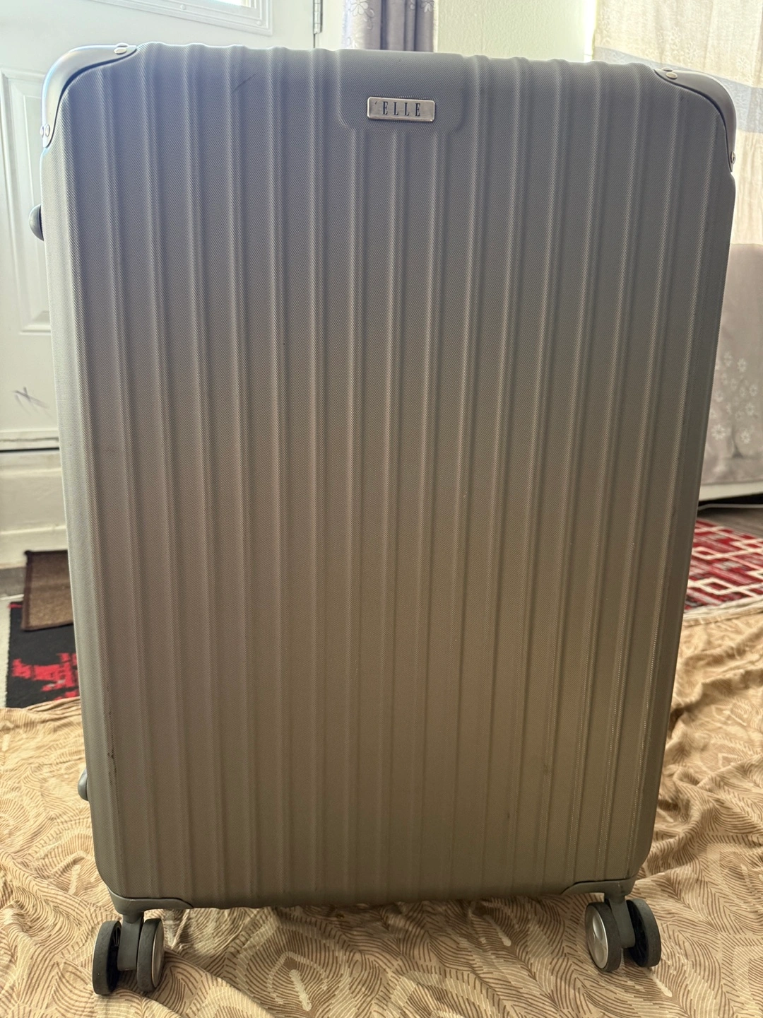 Selling a gently used ELLE hard shell luggage in olive green. It's in great shape and ready for your next trip! Features include a retractable handle and four wheels for easy maneuvering.