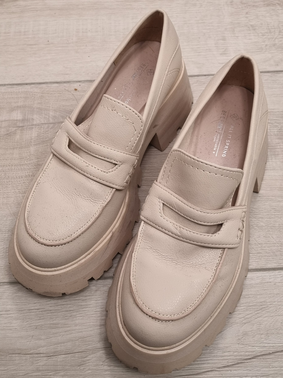 These Call It Spring loafers are a stylish addition to any wardrobe! They feature a chunky sole and a classic loafer design. The shoes are a light neutral/pink colour and are in great condition. Size 7.