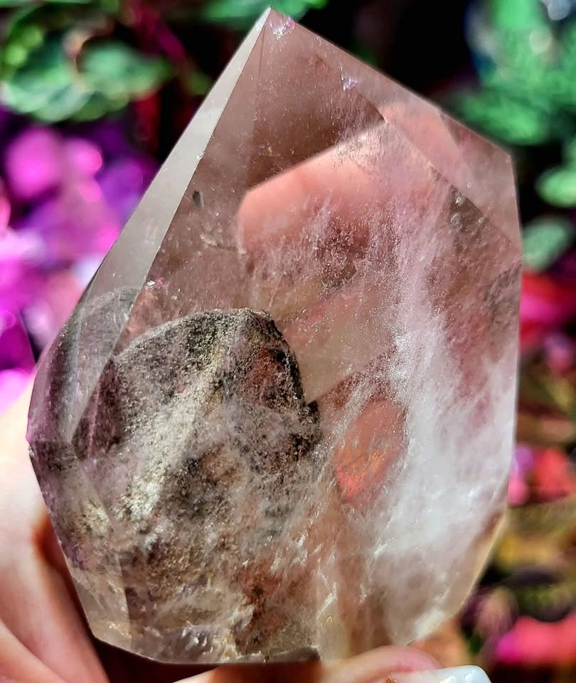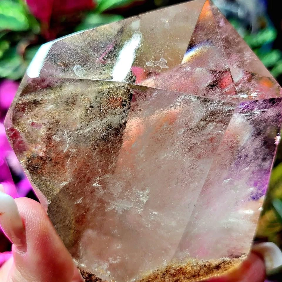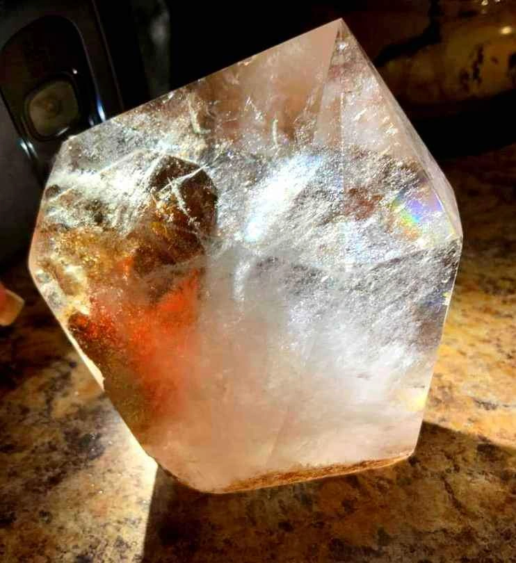 One very large manifestation quartz display piece grade AA quality this piece is super clear and has some amazing flashy rainbows inside. Manifestation quartz happens rarely in nature. It develops when a larger clear quartz crystal grows another crystal inside it. This tiny crystal can be a different variety of quartz depending on its mineral inclusions. It can be tangerine quartz (iron oxide), lodolite/garden quartz (chloride and iron), or fire quartz (red hematoid).