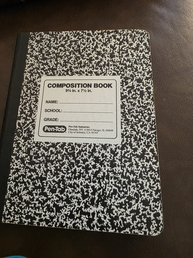 Selling a standard composition notebook. It's 9 3/4 inches by 7 1/2 inches. Perfect for school or jotting down notes!