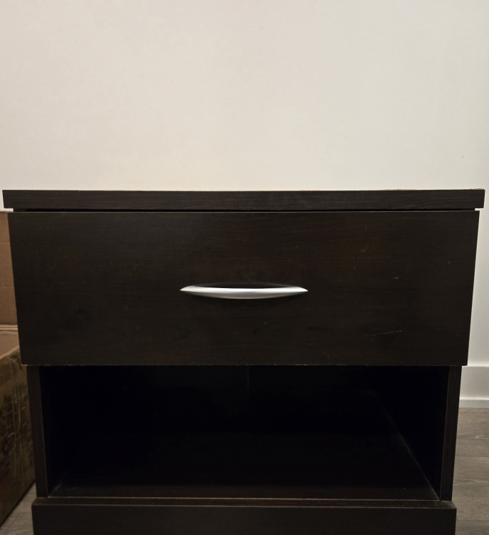 Selling a brown nightstand. It has one drawer and an open shelf below with ample space. It's in good condition and would be a great addition to any bedroom.