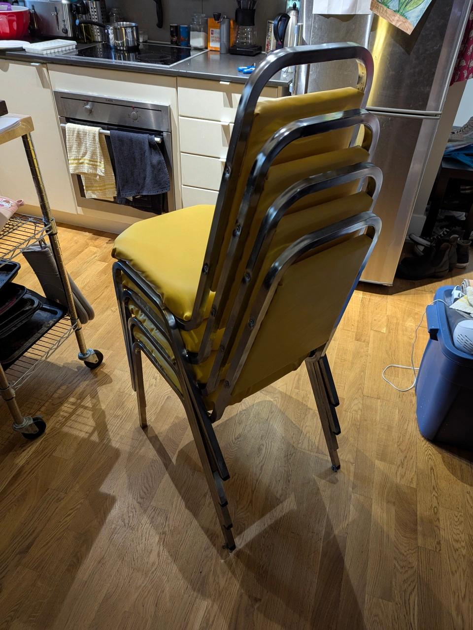 Selling a set of four yellow stacking chairs. They're perfect for extra seating and easy to store when not in use. Great for parties, events, or just having around the house!