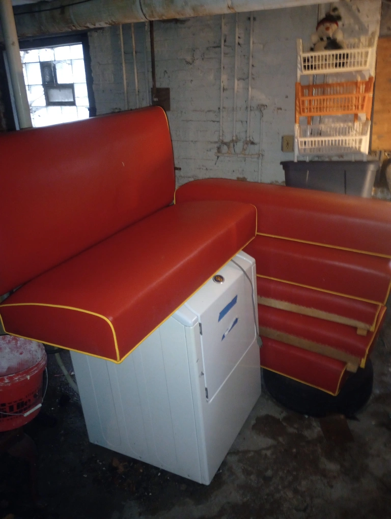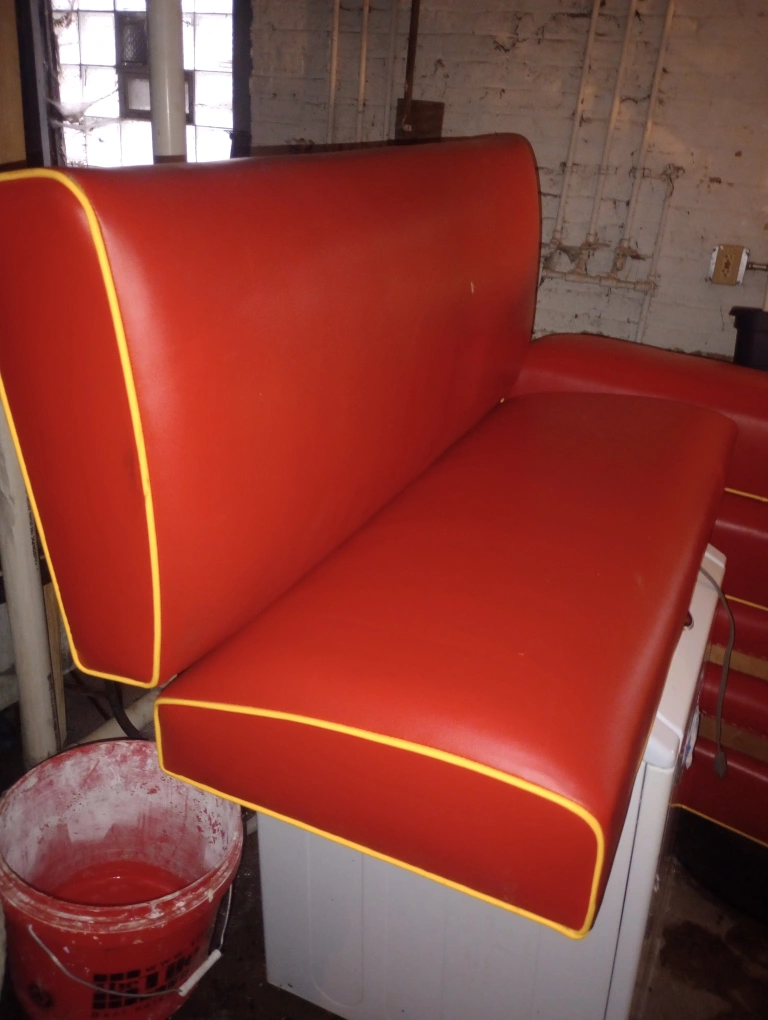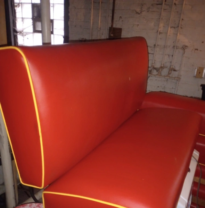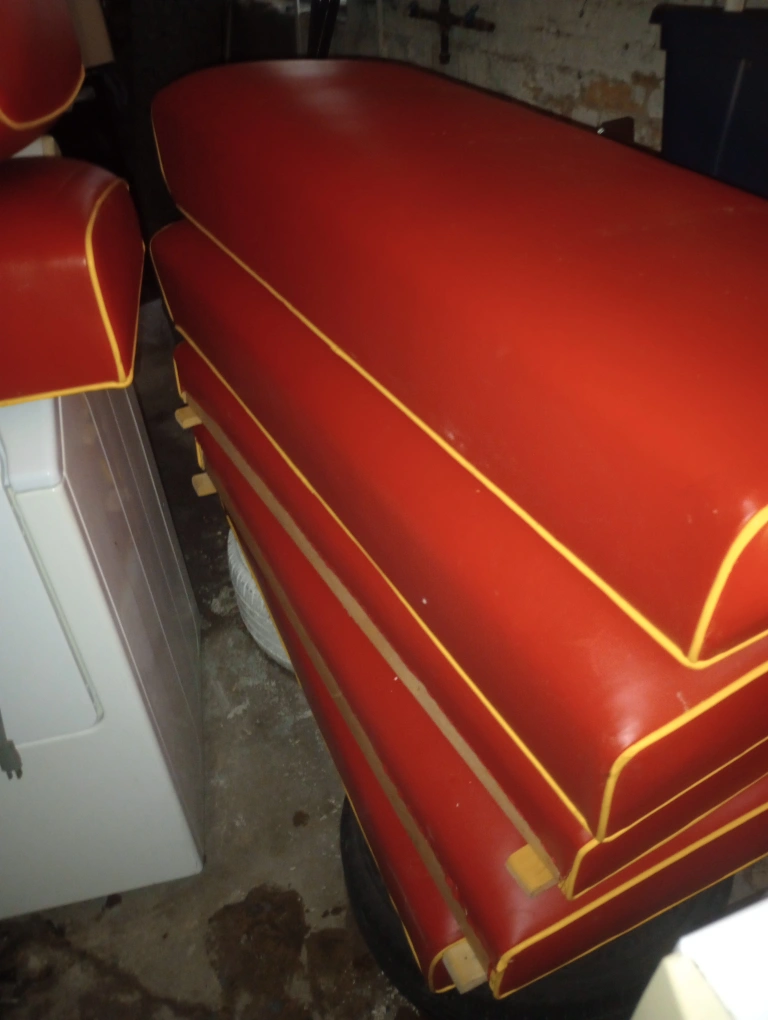Selling 7 red vinyl booth seats with yellow trim! They look to be in good condition and ready for a new home. Perfect for a retro diner or kitchen setup