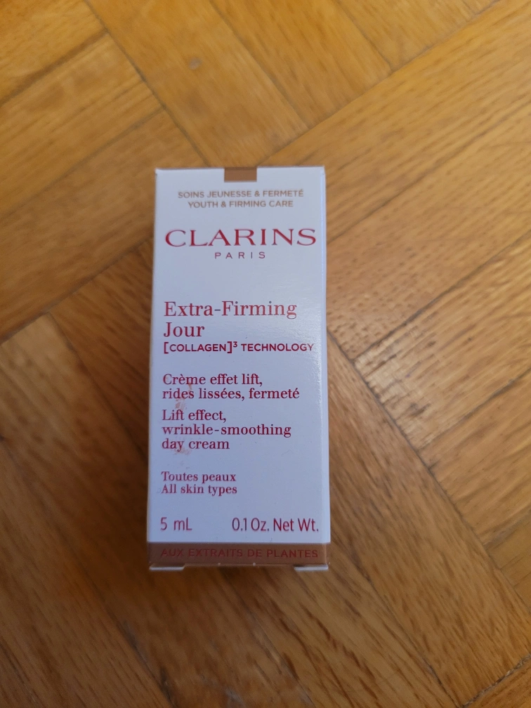 Clarins Extra-Firming Jour day cream. It's a youth and firming care product with [COLLAGEN]³ Technology.