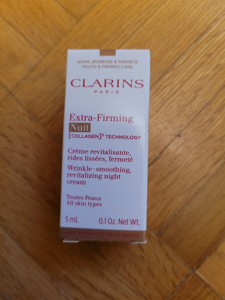 Clarins Extra-Firming Nuit night cream! It features [COLLAGEN]³ TECHNOLOGY and is designed to be a wrinkle-smoothing, revitalizing night cream.